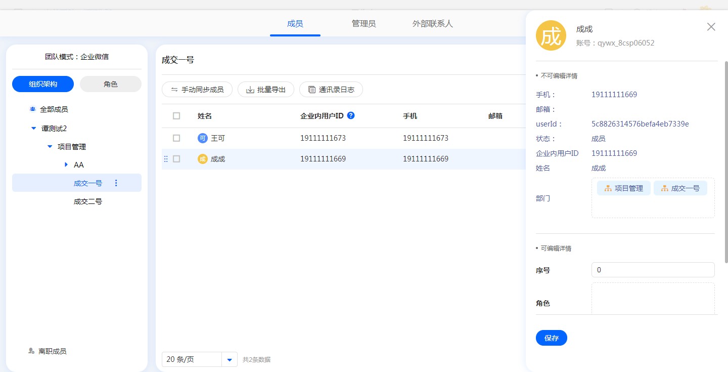 开启自动同步后,会同步企业微信成员姓名、账户(企业内用户ID)、手机、邮箱等信息,修改这些信息需要在企业微信中进行修改,系统通讯录中不支持修改。
