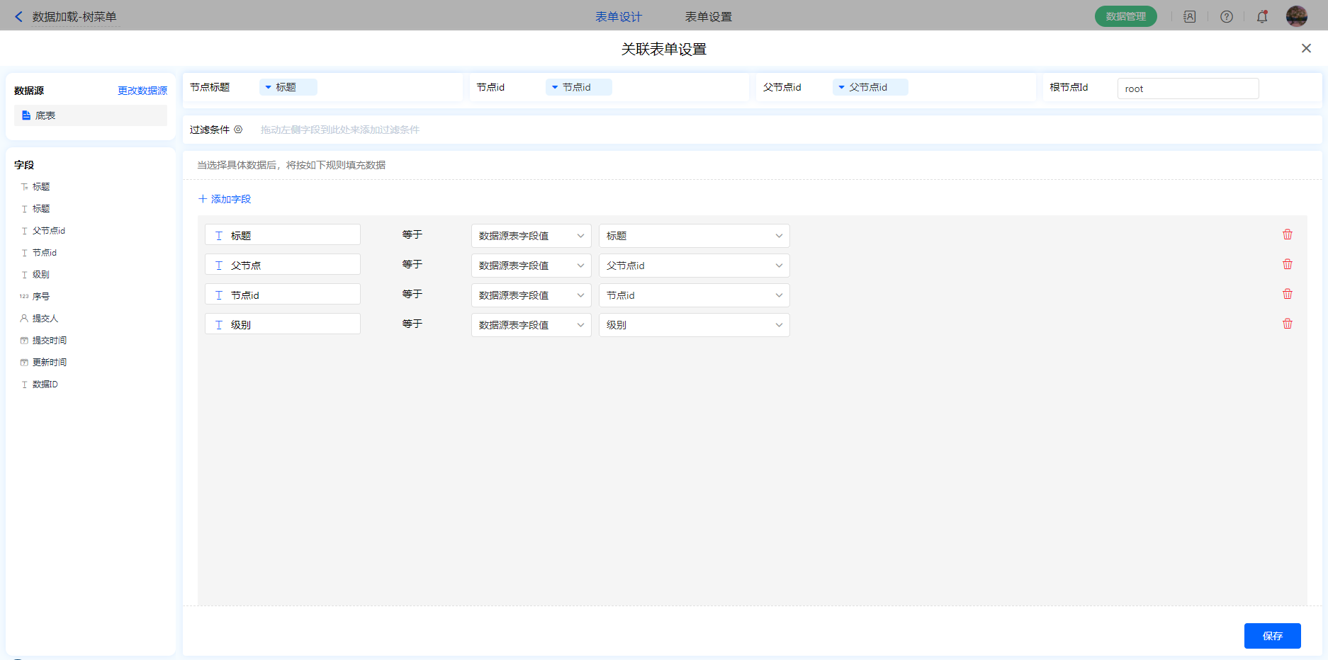 进入表单设计界面,拉取【数据加载】字段,字段属性>>显示模式选择【树菜单】,点击关联表单设置>>【数据加载设置】配置数据源 选择节点信息设置填充规则。