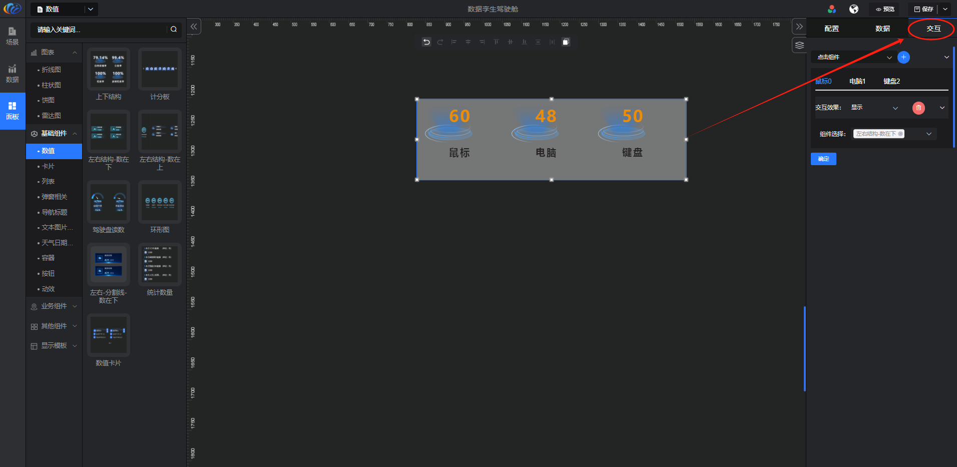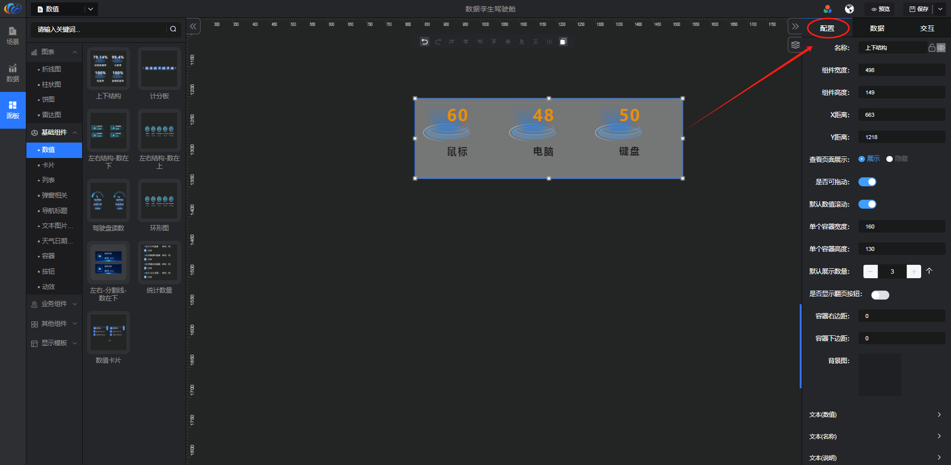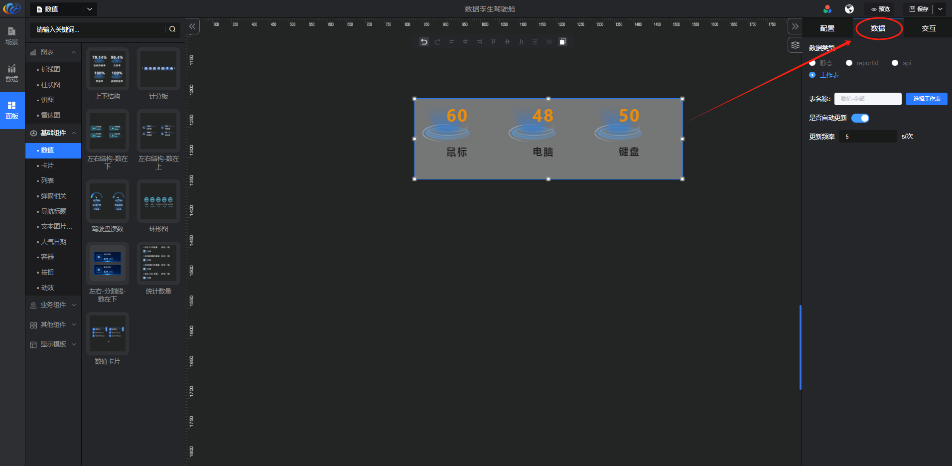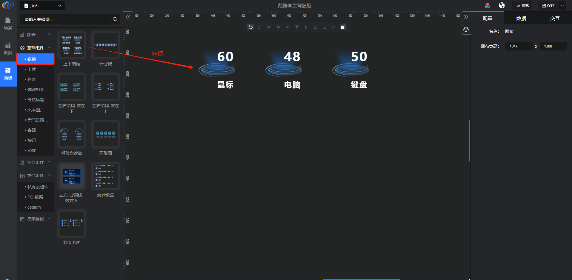 进入面板,展开【基础组件】点击「数值」右侧显示数值的所有组件,可对其拖拽至黑色画布进行配置。