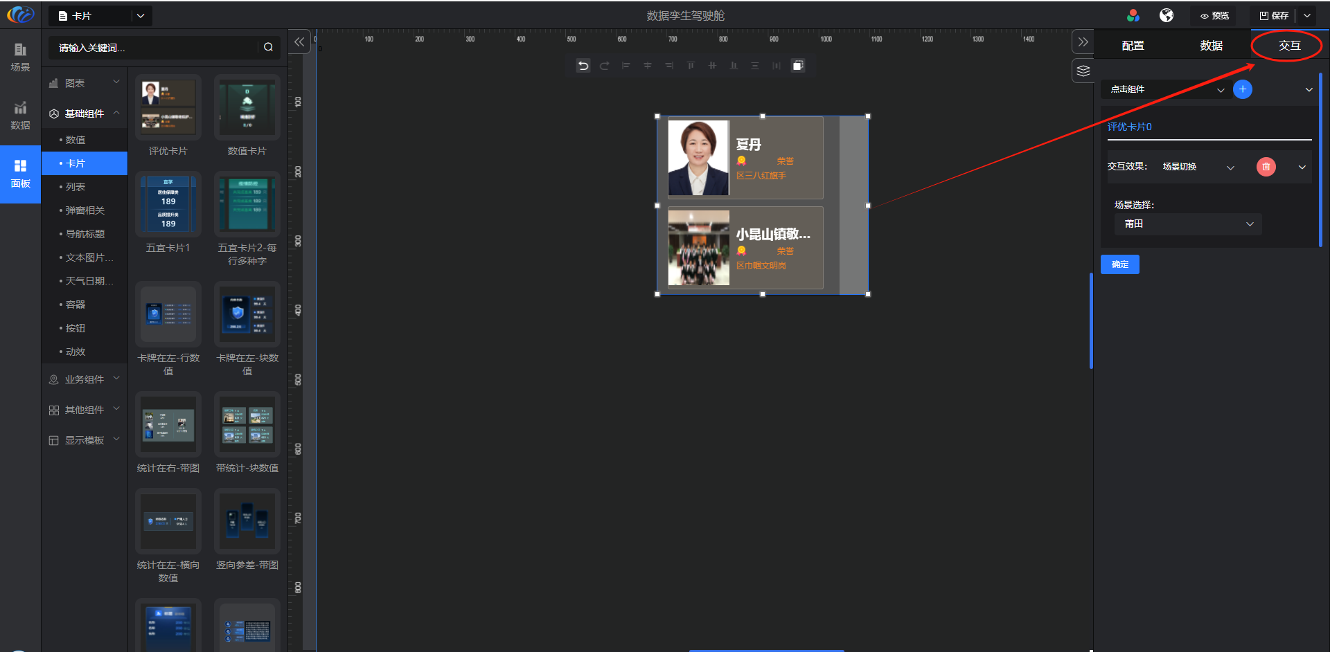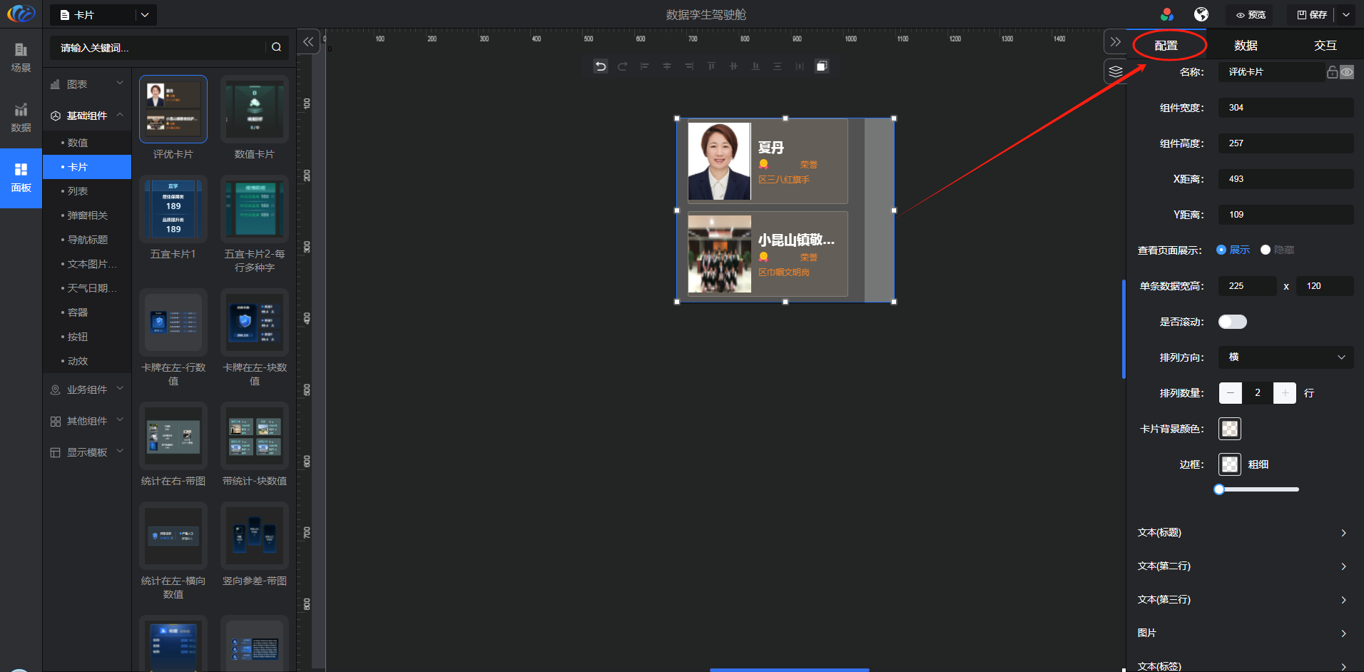 进入面板,展开【基础组件】点击「卡片」右侧显示数值的所有组件,可对其拖拽至黑色画布进行配置。