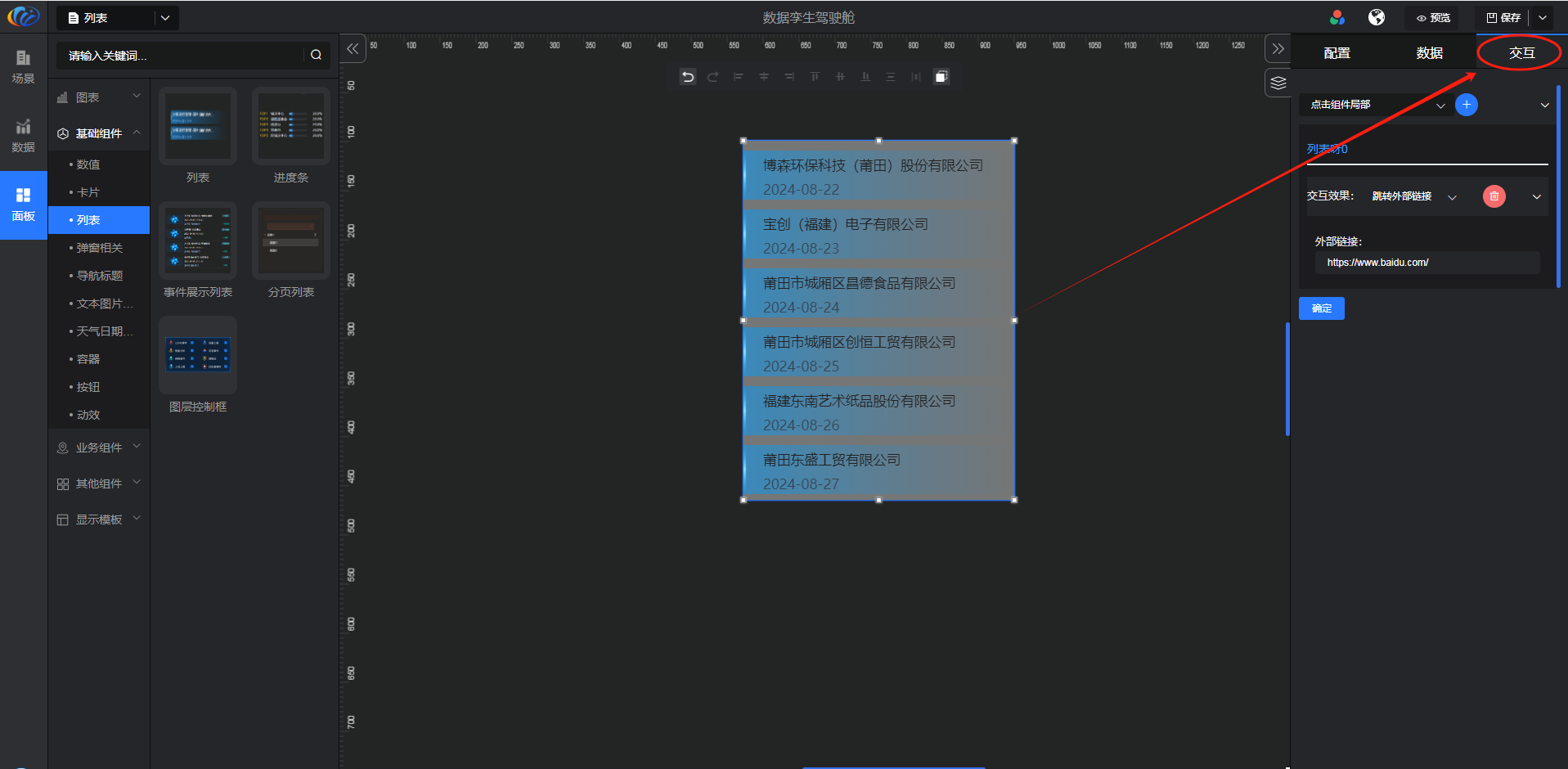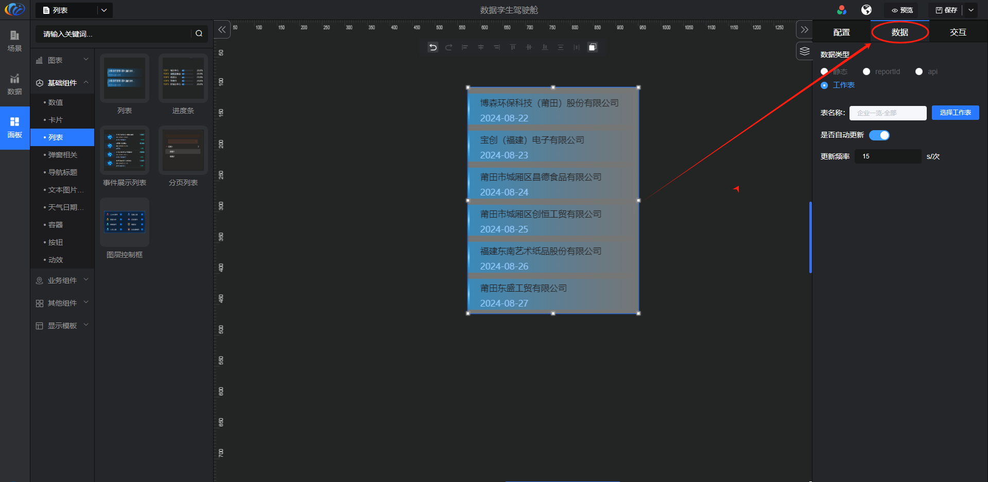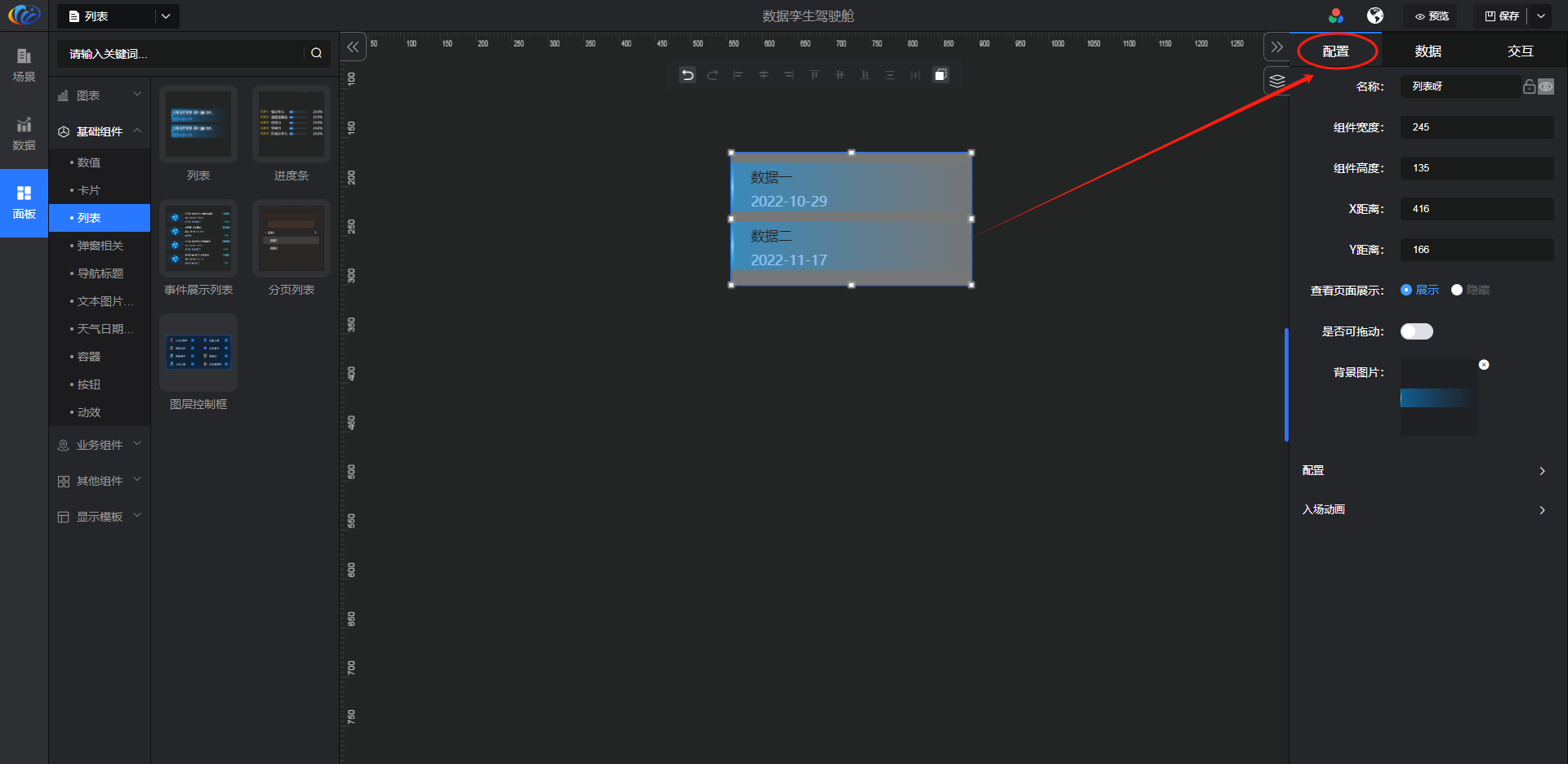 进入面板,展开【基础组件】点击「列表」右侧显示数值的所有组件,可对其拖拽至黑色画布进行配置。