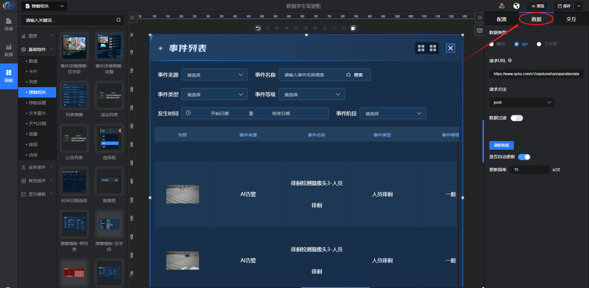 进入面板,展开【基础组件】点击「弹窗相关」右侧显示数值的所有组件,可对其拖拽至黑色画布进行配置。