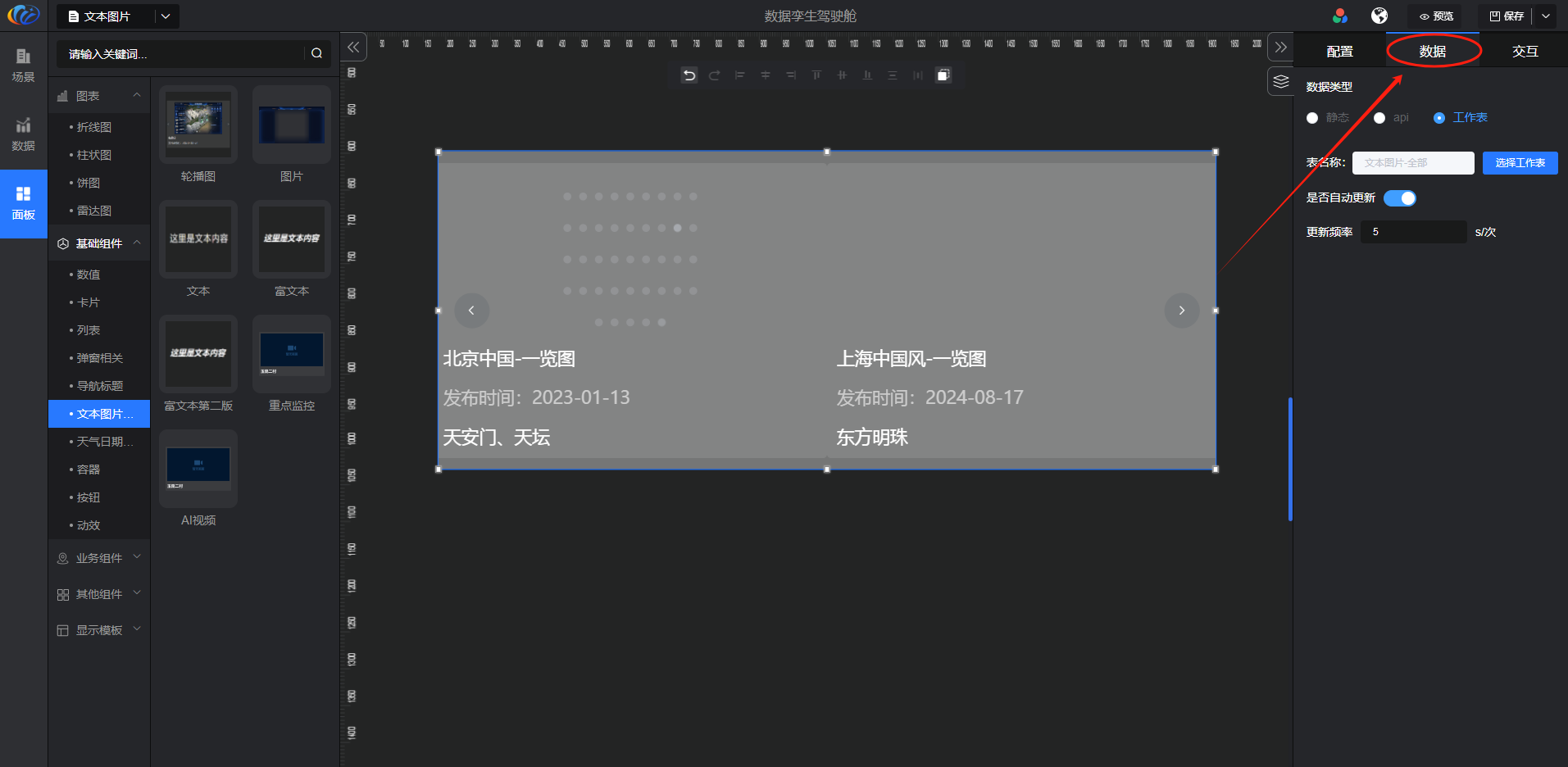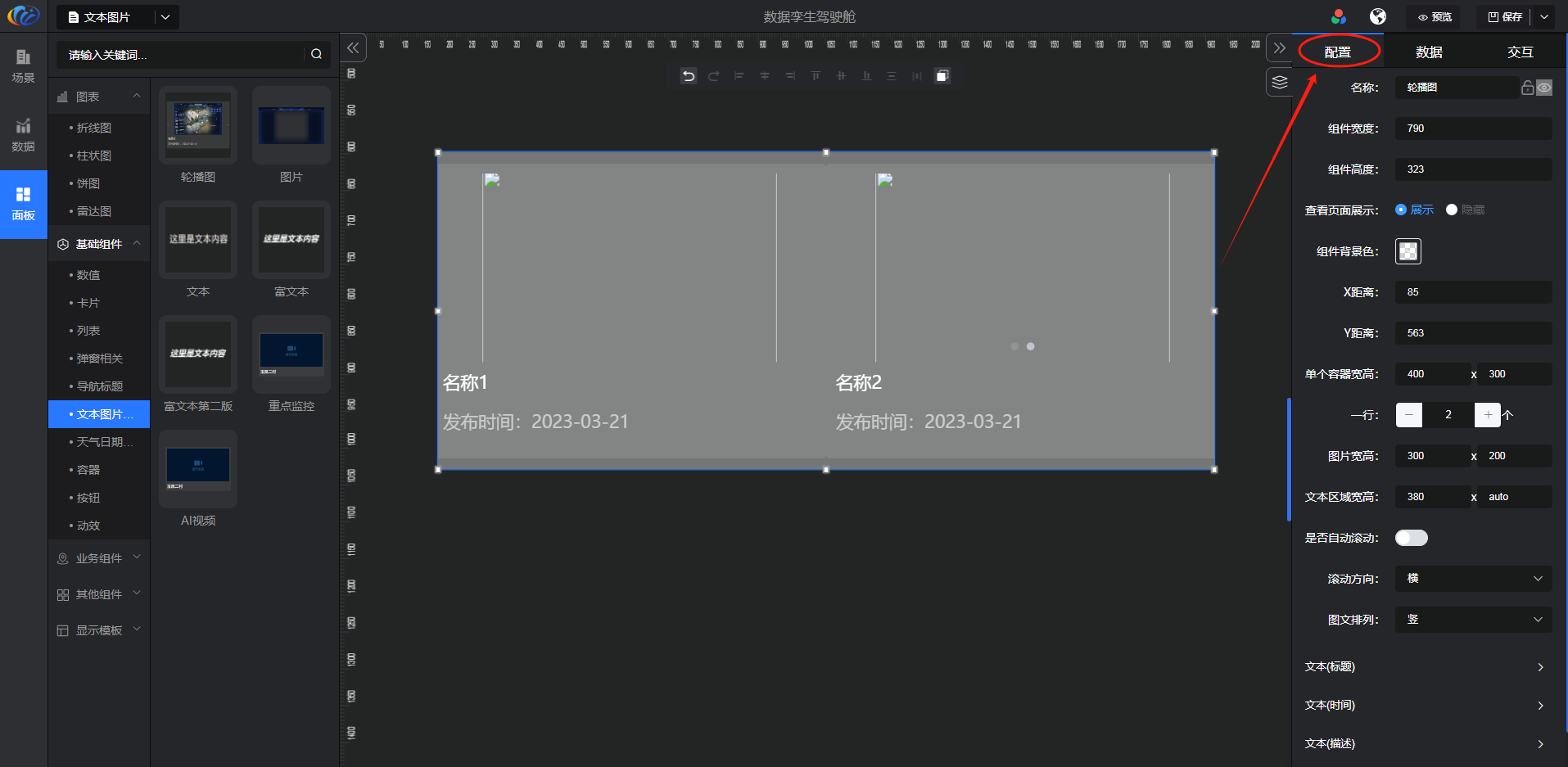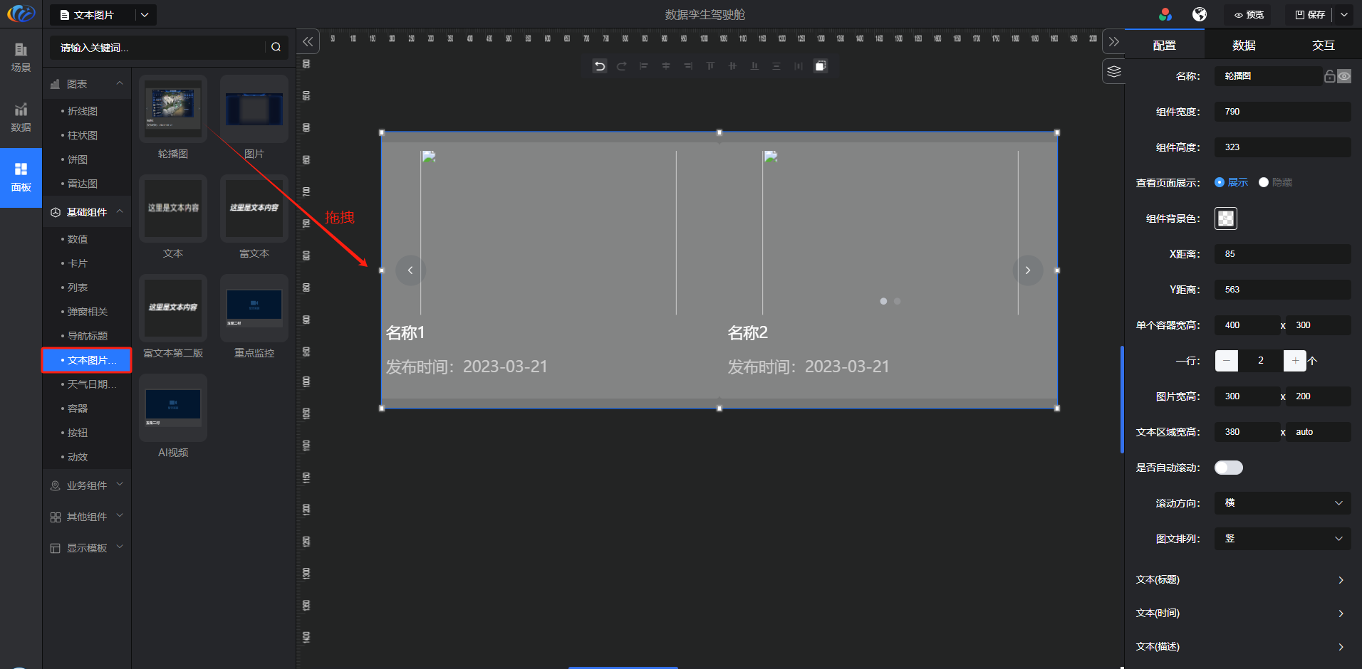 进入面板,展开【基础组件】点击「文本图片」右侧显示数值的所有组件,可对其拖拽至黑色画布进行配置。