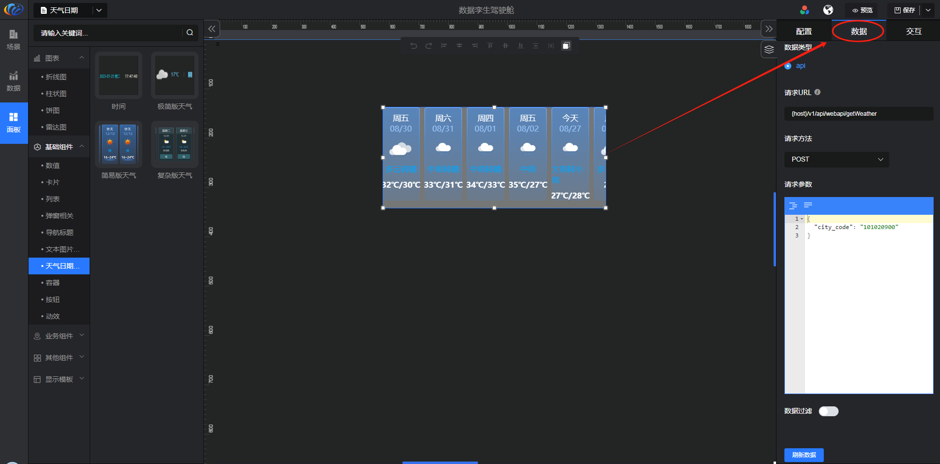 进入面板,展开【基础组件】点击「天气日期」右侧显示数值的所有组件,可对其拖拽至黑色画布进行配置。