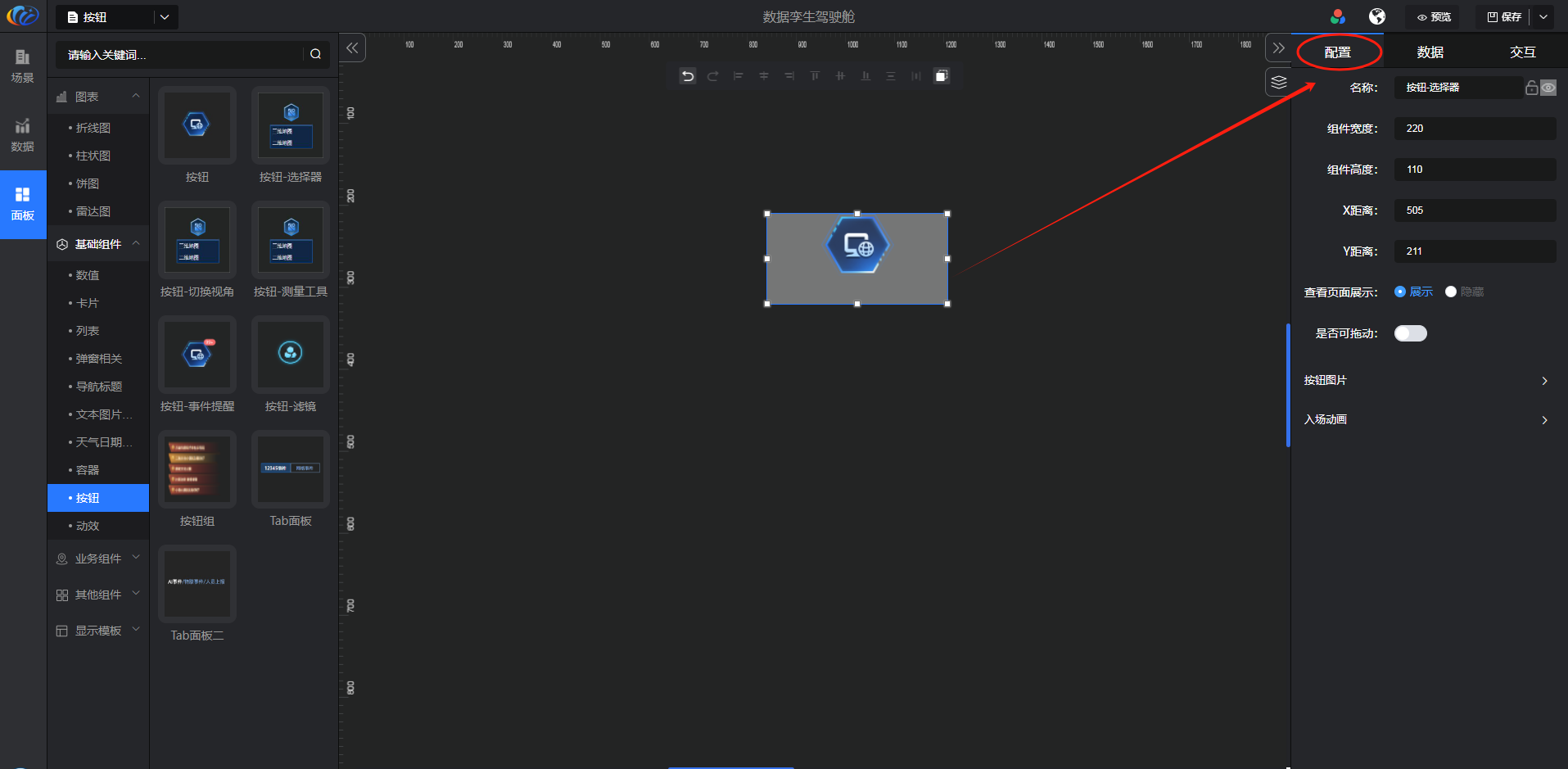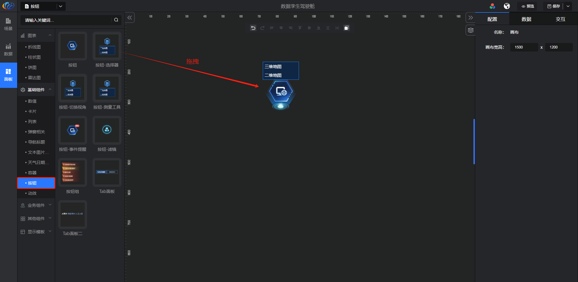 进入面板,展开【基础组件】点击「按钮」右侧显示数值的所有组件,可对其拖拽至黑色画布进行配置。
