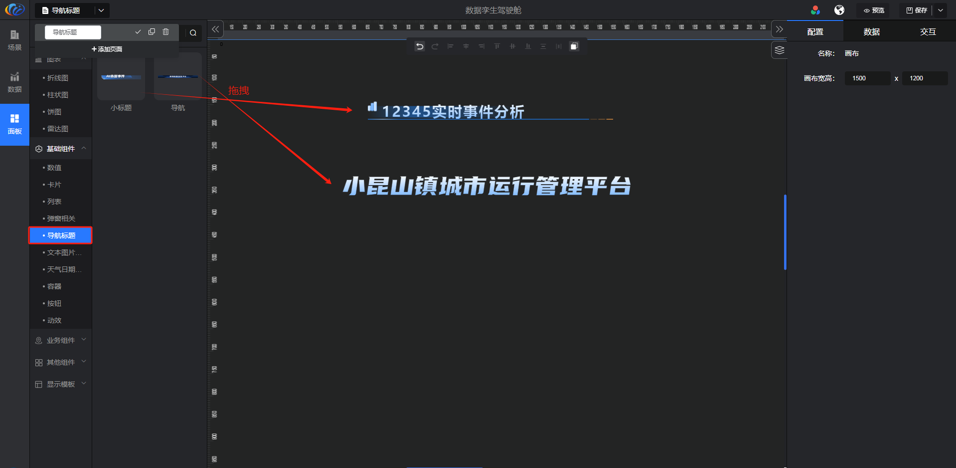 进入面板,展开【基础组件】点击「导航标题」右侧显示数值的所有组件,可对其拖拽至黑色画布进行配置。