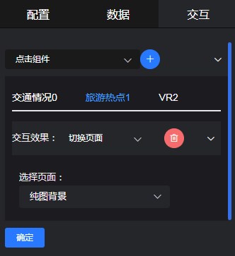 当大屏设置了多个页面时,可以设置页面切换效果。如 Tab面板 组件,点击不同tab切换到指定页面。