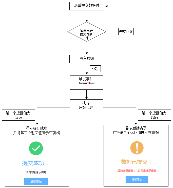 | 前置返回 | False:拦截提交操作 | 前端展示文本信息,为空提示“提交成功” | 根据json字符串,修改前端表单字段赋值与属性 |