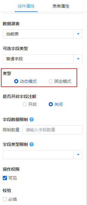 类型是设置字段添加字段的模式,类型有两种,分别是动态模式和固定模式。