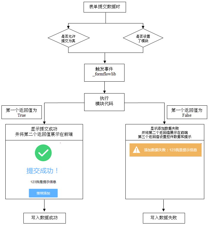 触发事件后,前端页面会将"当前表单别名","表单数据信息","数据提交类型"传给后端对应的云应用中的"_formflow"函数,然后执行"后端代码"并返回"返回结果"和"需要界面展示的数据"。