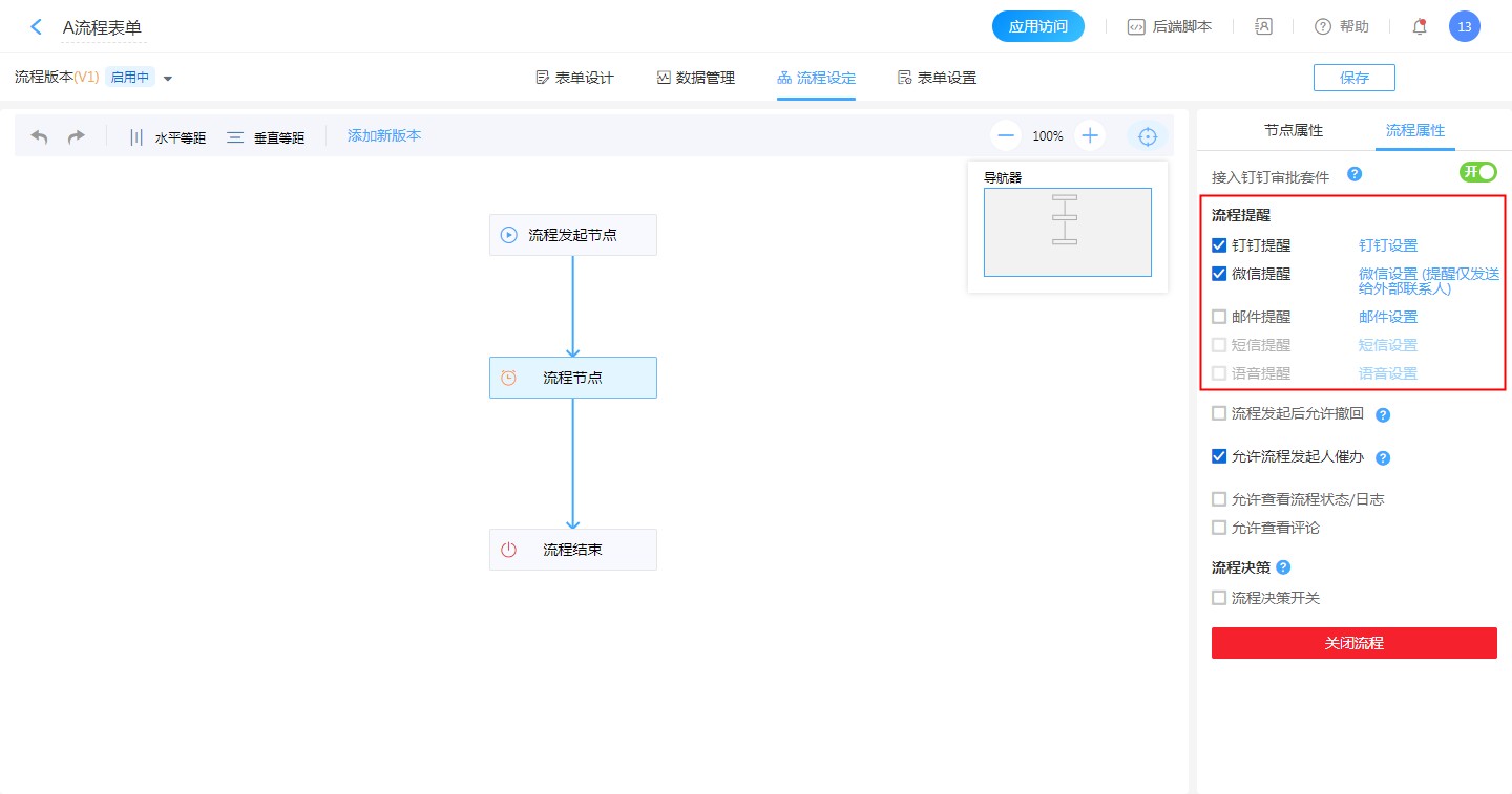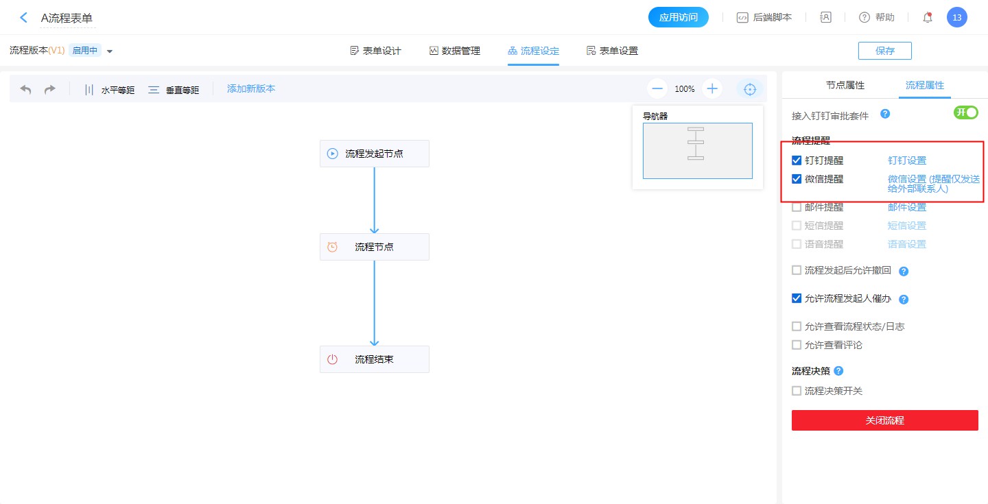 当有外部联系人参与流程流转或者需要接收表单消息时,可以勾选微信提醒方式,需要注意的是,钉钉团队模式下,微信消息只能发送给外部联系人,内部成员就算绑定了微信也不会收到微信消息。