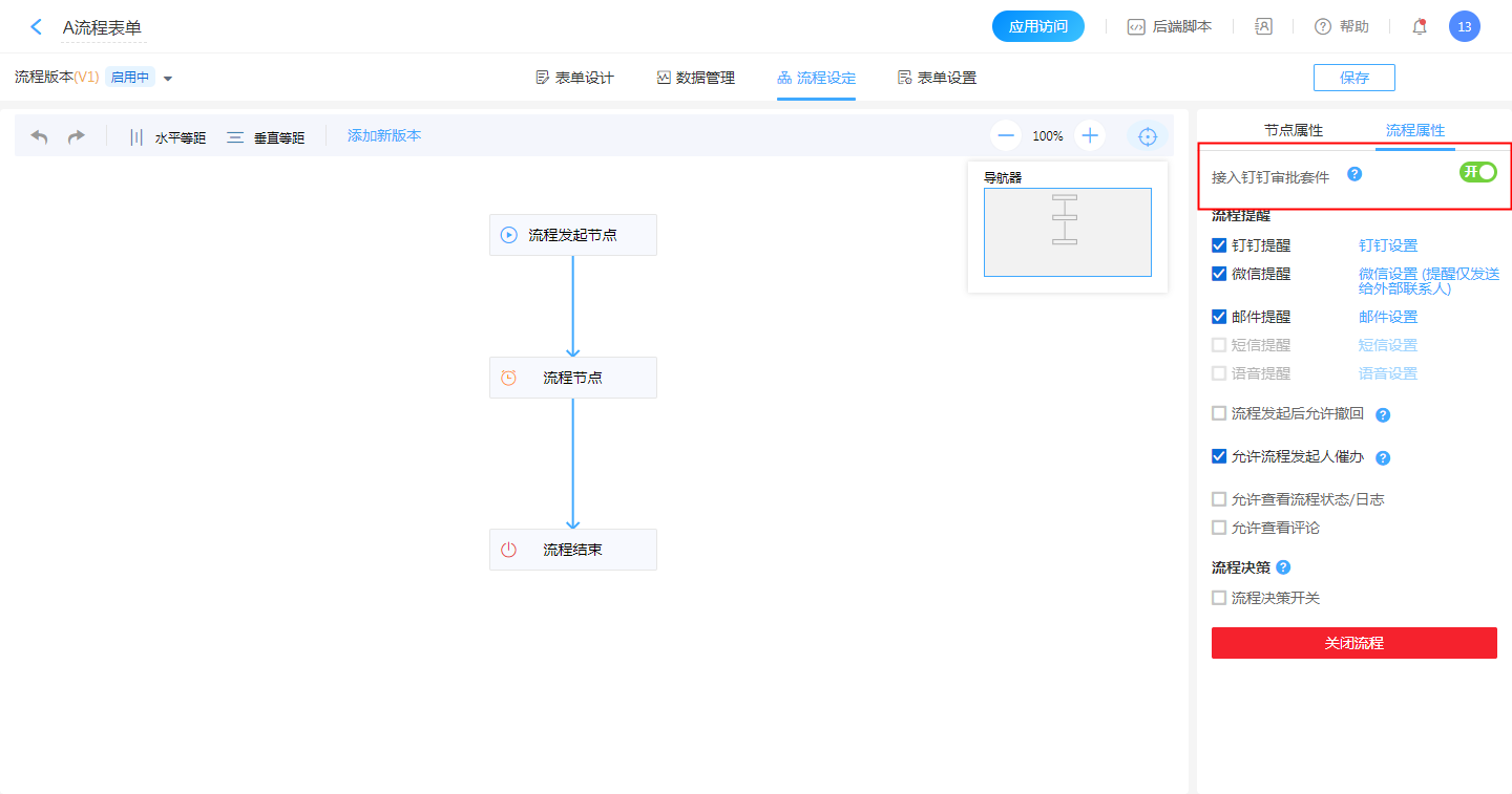 1、流程设置需要开启【接入钉钉审批套件】