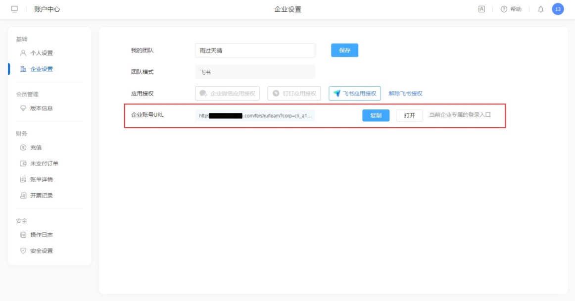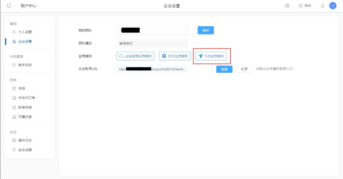 一码通账号登录系统后,进入【右侧头像】-【账号中心】-【企业设置】,在企业设置中可以进行飞书应用授权。