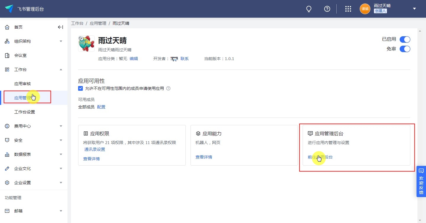注意:从飞书管理后台进入一码通系统,自动使用一码通账户登录。