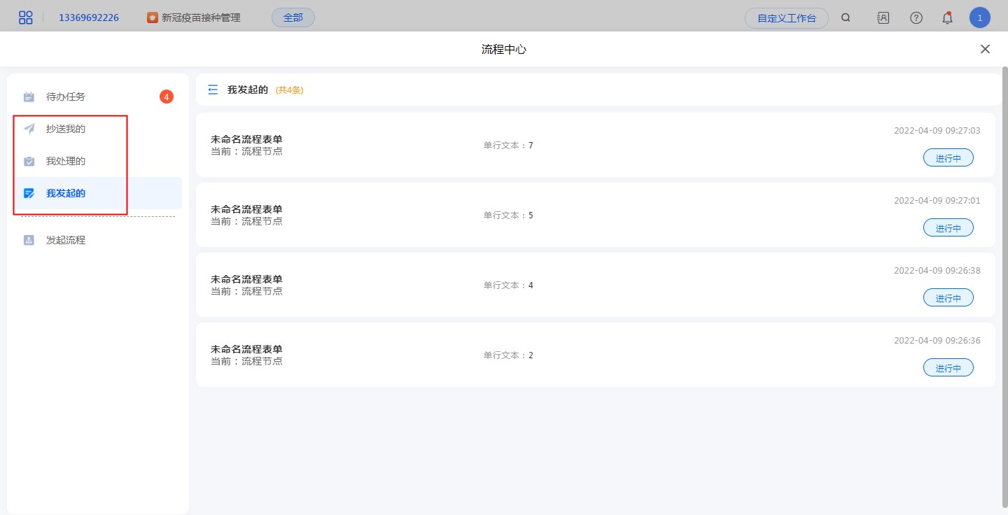- 我发起的:当前账号下所有应用中我发我的流程事务。