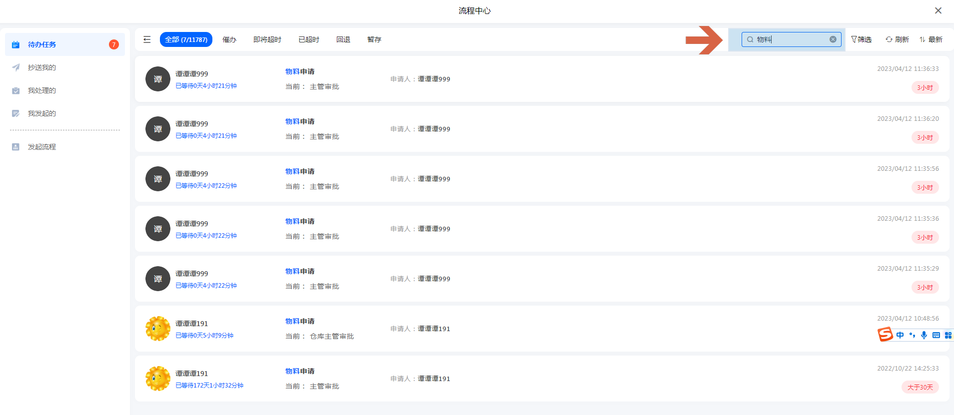 待办任务/抄送我的/我处理的/我发起的下,均支持快捷搜索和关键字搜索;快捷搜索和关键字搜索支持组合使用。
