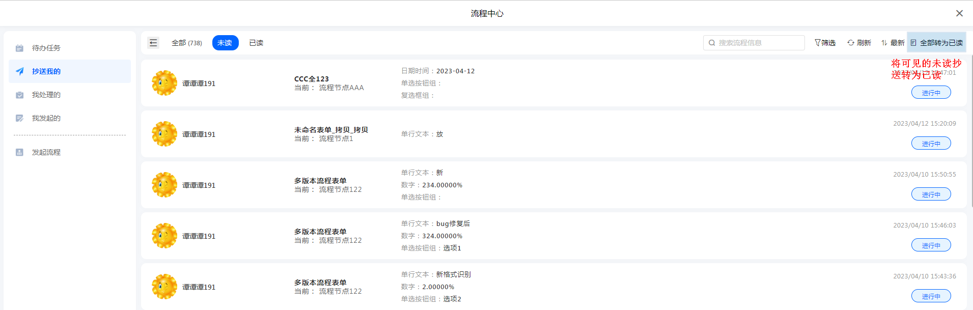 全部转为已读:抄送我的下,全部转为已读功能,指将可见的未读抄送转为已读。