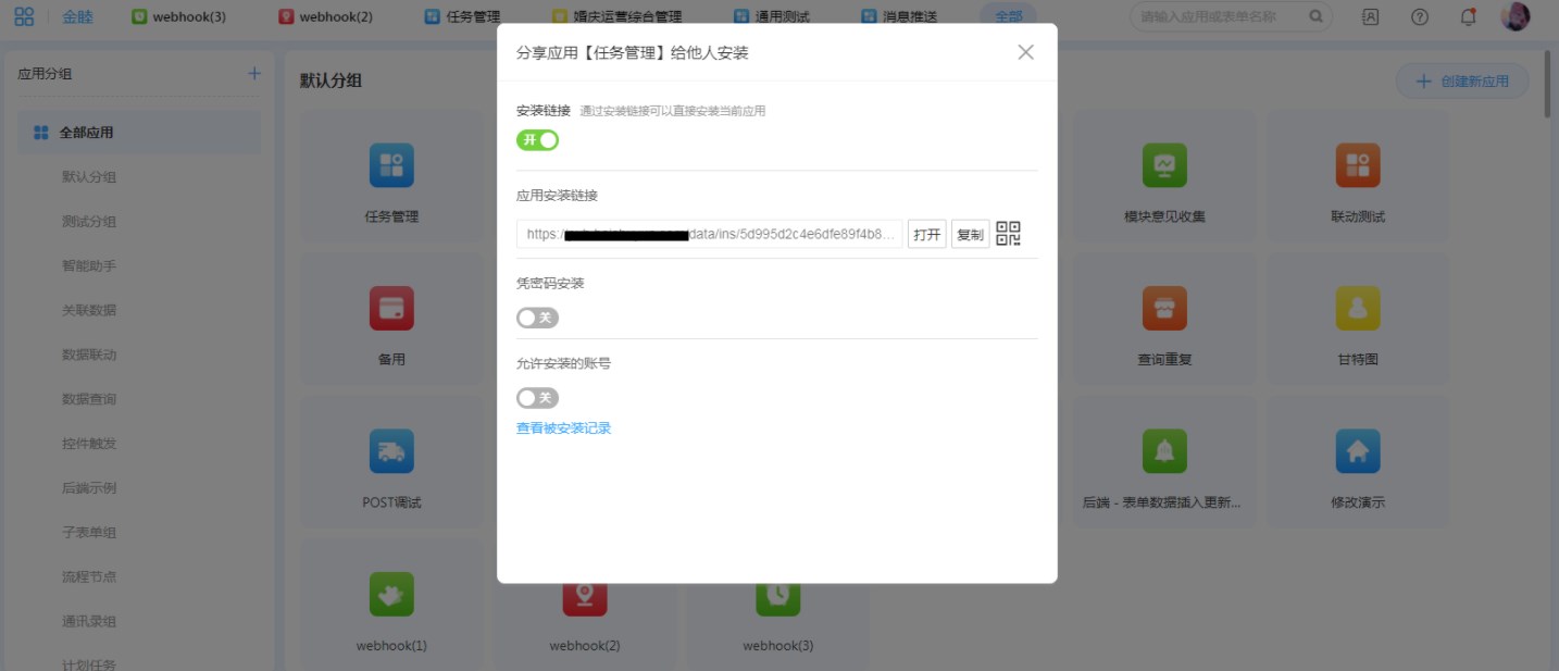 分享给他人安装即可以自由选择自己账号下的应用给其他人安装,只需开启安装链接,别人就可以通过链接或二维码扫码安装应用。