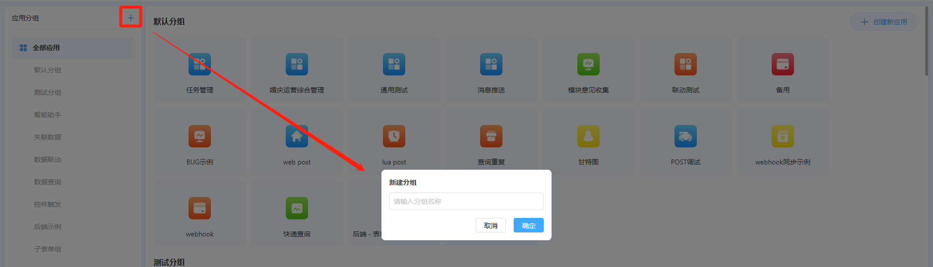 用户可以通过在工作台左侧「应用分组」处点击+按钮创建新分组。