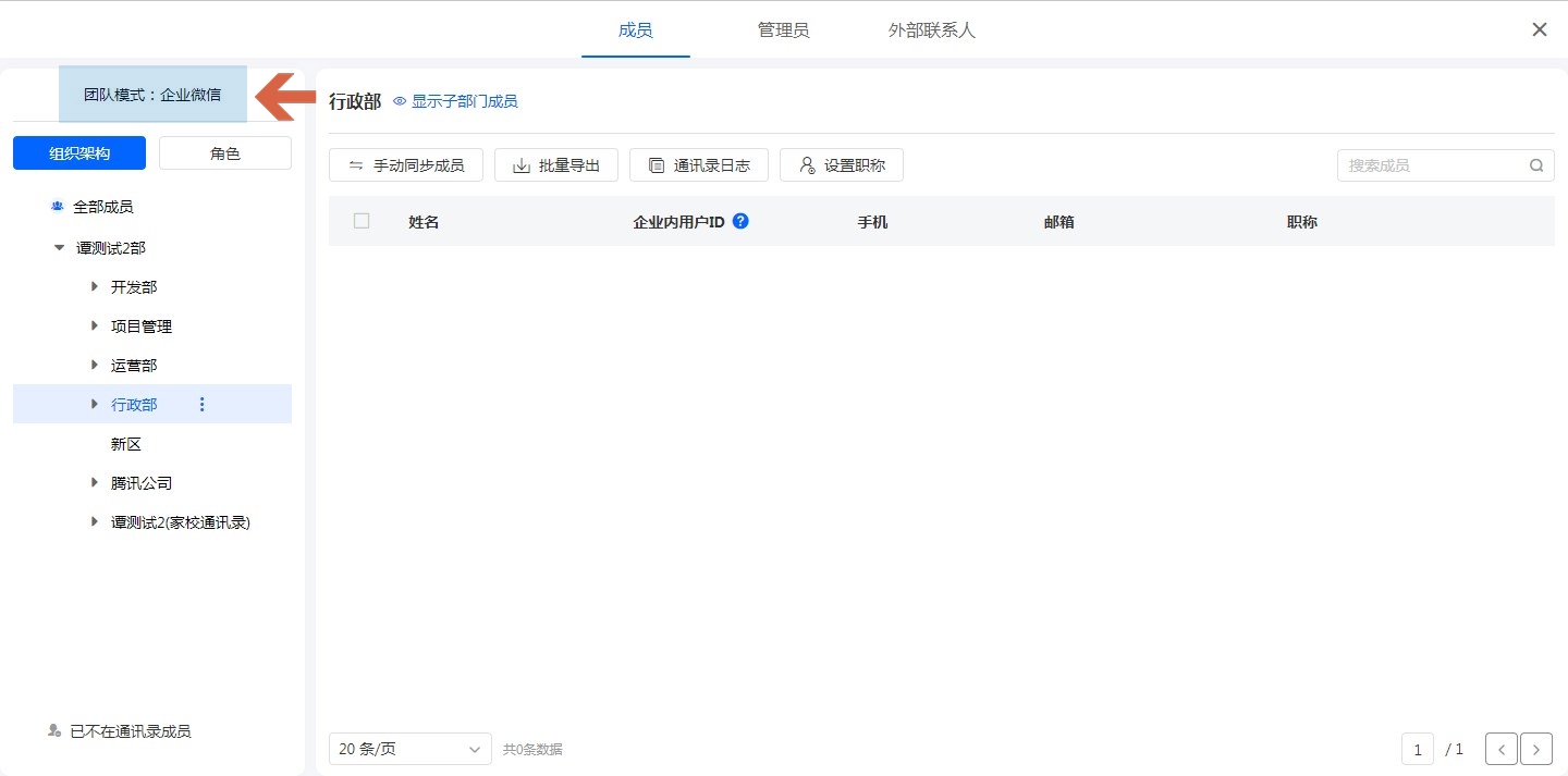 如果是一码通账号的形式的团队则是普通模式,如果是企业微信/钉钉模式/飞书模式的团队,则需要在企业微信/钉钉/飞书管理后台同步组织架构。