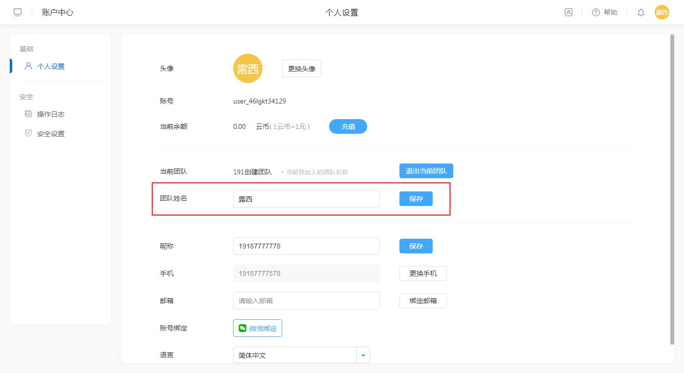 成员可以切换到团队,然后在个人中心修改团队姓名。