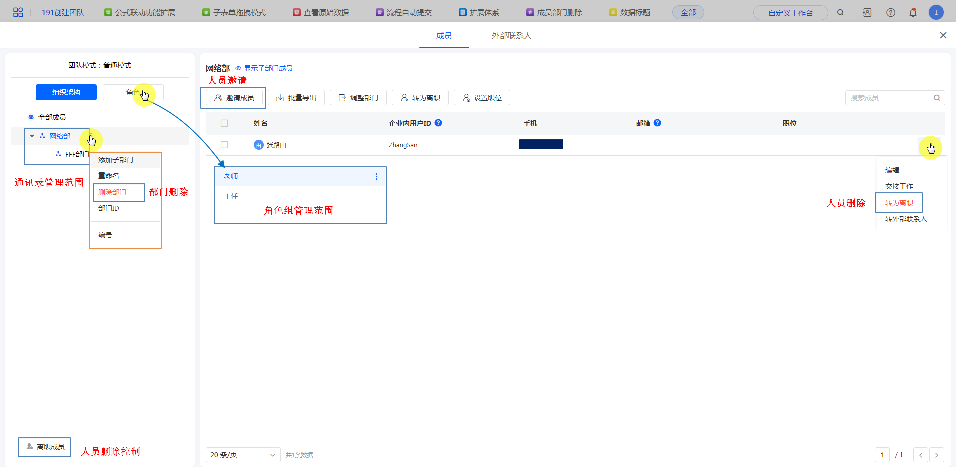 不同的部门负责人管理各自的应用和部门成员。