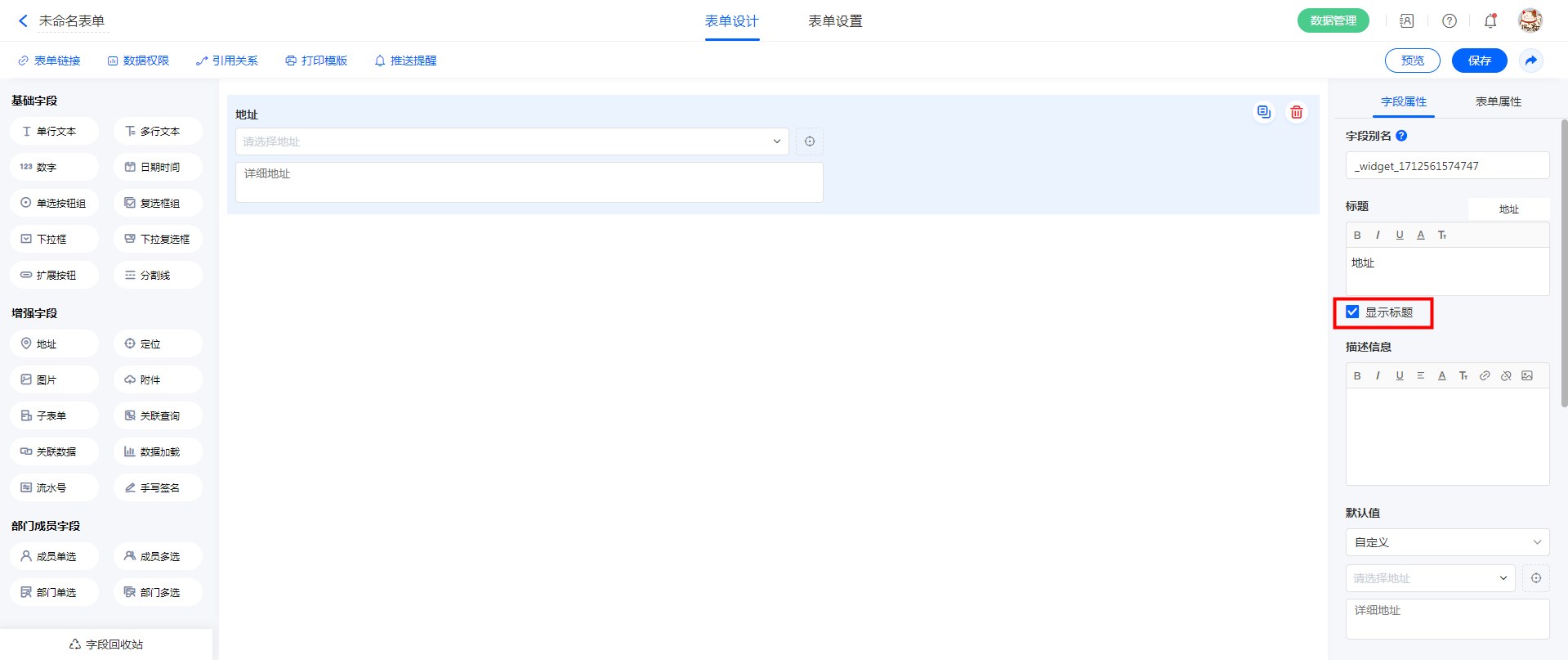 “地址”字段专门用来填写地址格式信息,其中“省、市、区”可以直接选择,无需手动填写,能够有效提高地址信息录入效率。