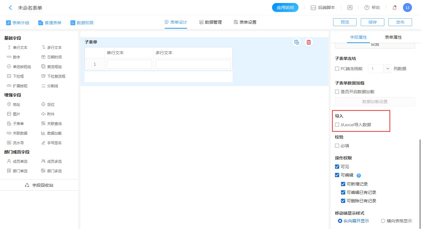 子表单支持从Excel直接导入数据到子表单中,勾选本选项后当前子表单可通过Excel导入的方式填入数据。
