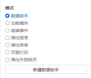 模式分为:功能插件、数据助手、前端事件、弹出表单、弹出报表、页面打印、弹出外部网页。