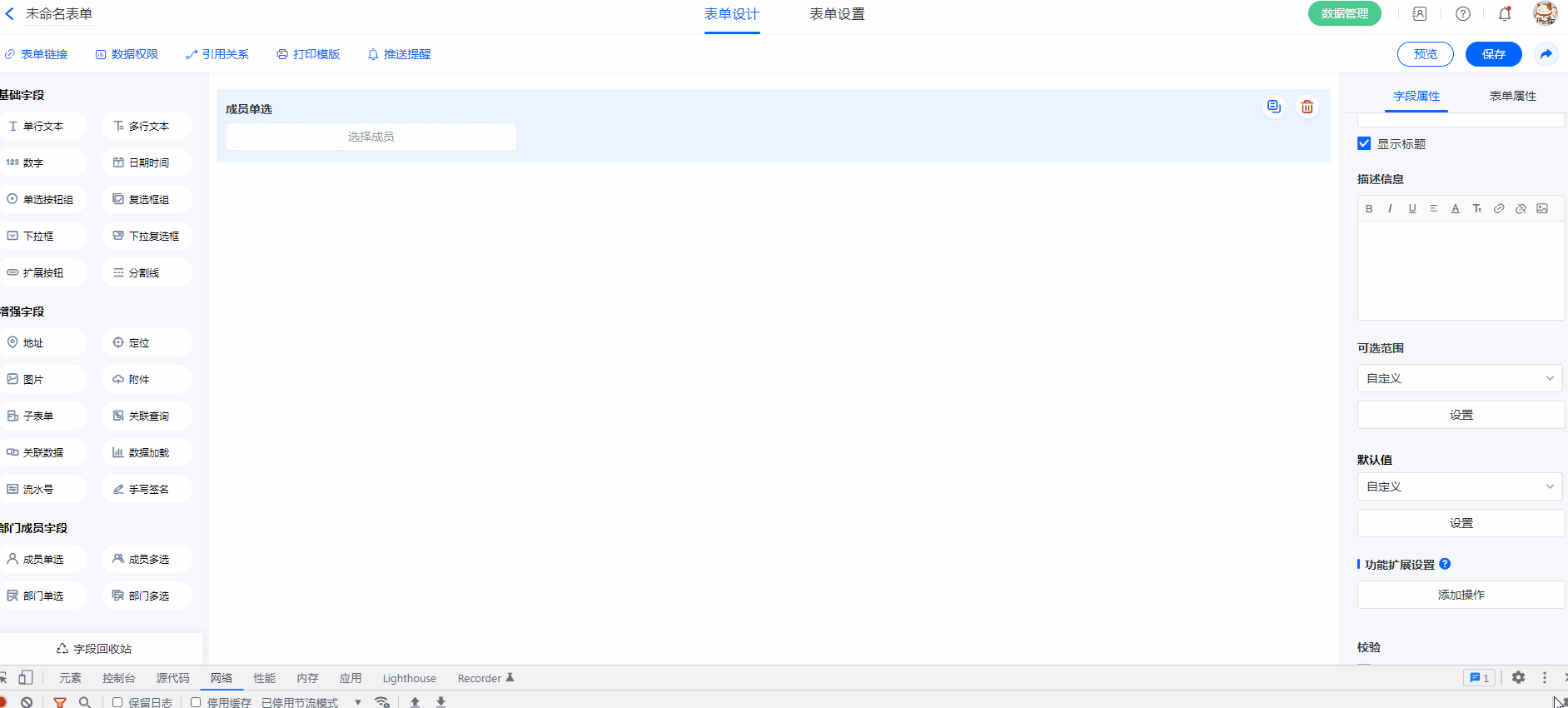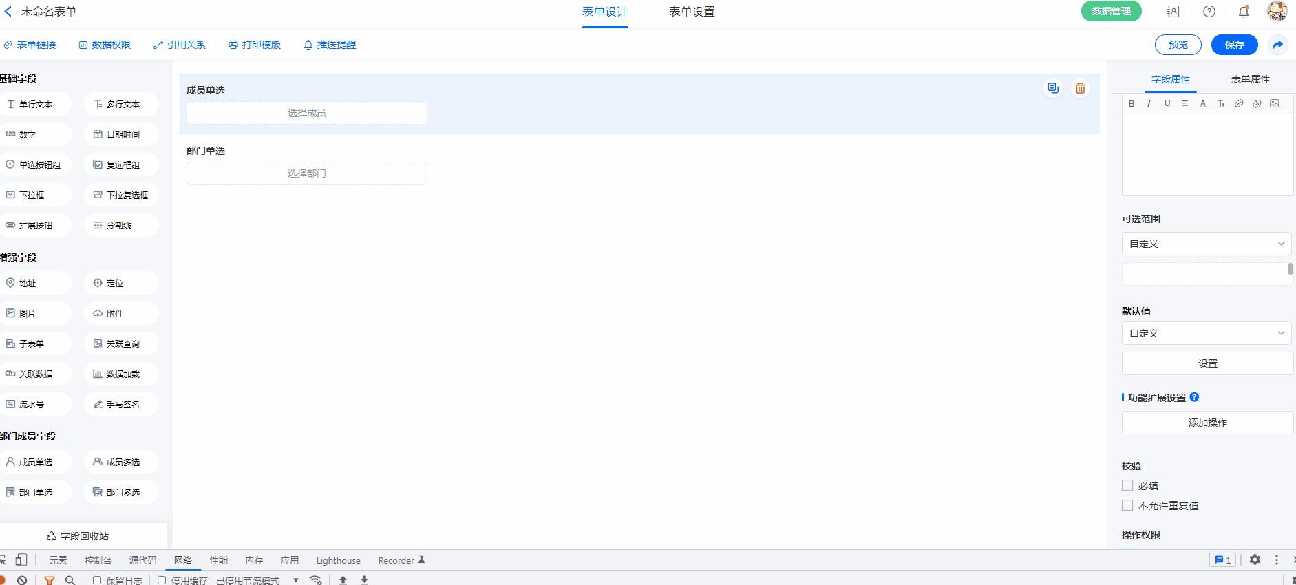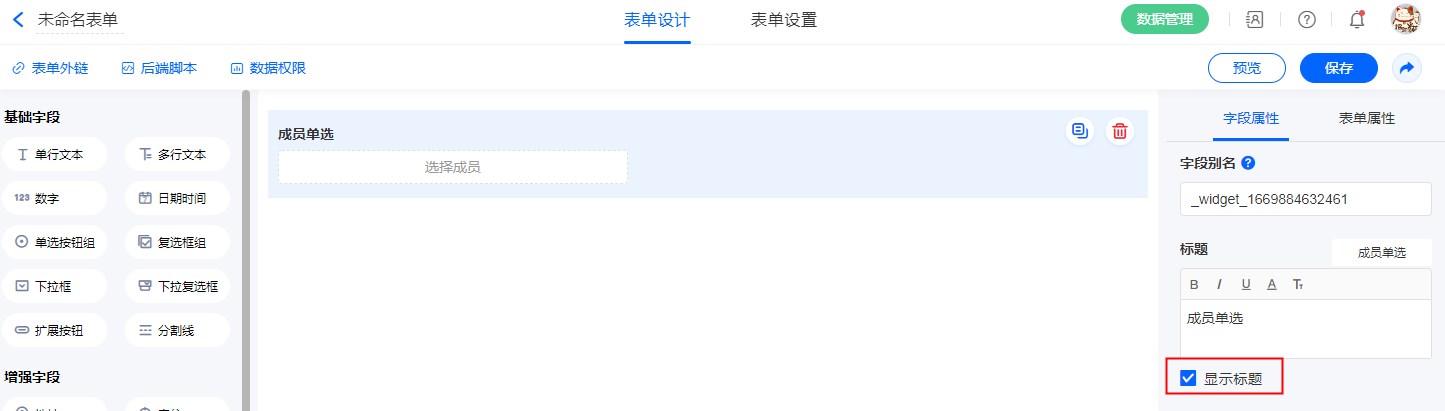 注意:表单外链不支持成员字段/部门字段,只有在系统数账号内访问表单,才可使用成员字段/部门字段。