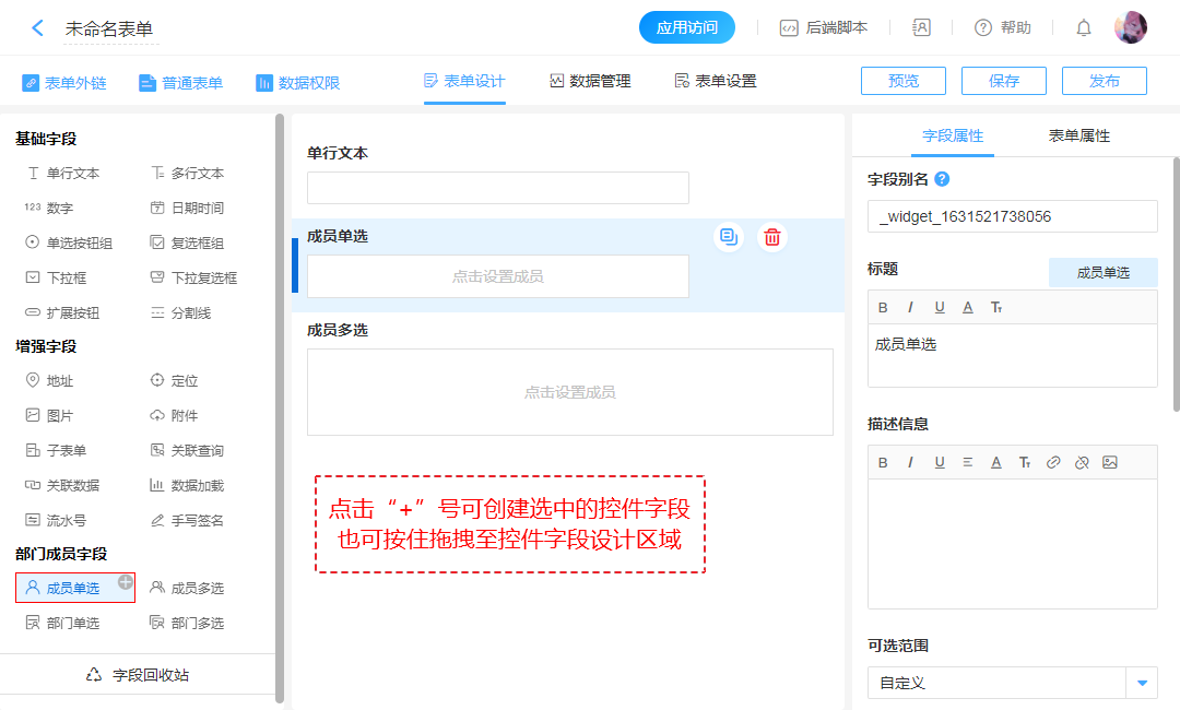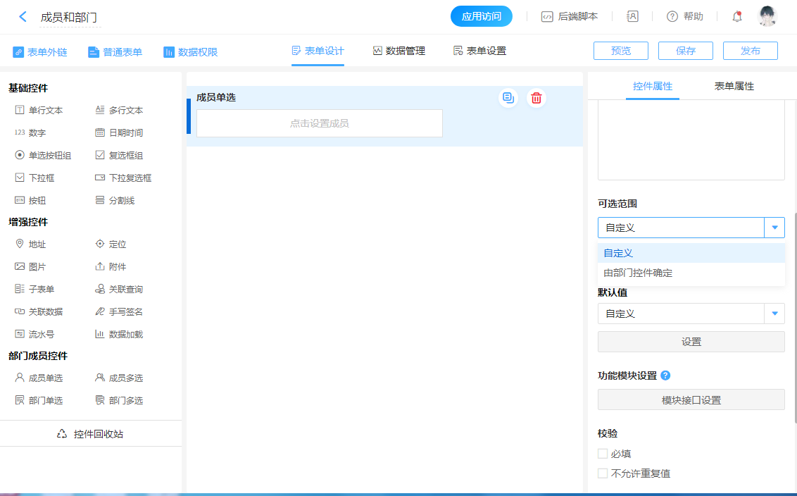 - 成员字段的可选范围:自定义、由部门字段确定。