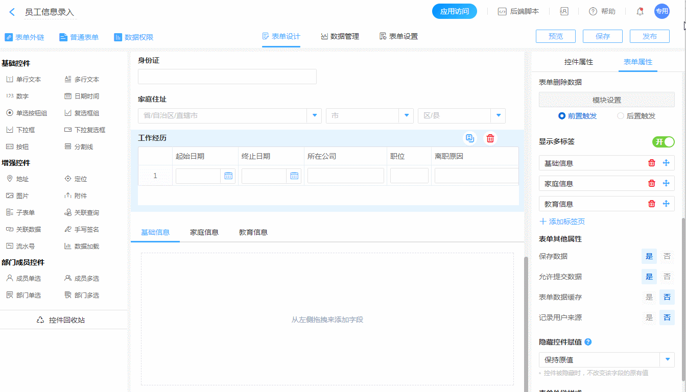 - 如表单控件太多,除了可以选择分成多张表单录入外,还可以通过分标签的布局方式,可以让我们的数据结构更加分明。