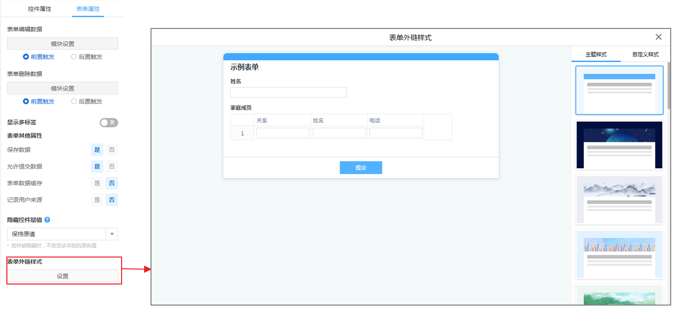 表单外链的样式分为主题样式和自定义样式,主题样式即一码通内置的样式模板我们选择就可使用。自定义样式即由自己自定义设置。