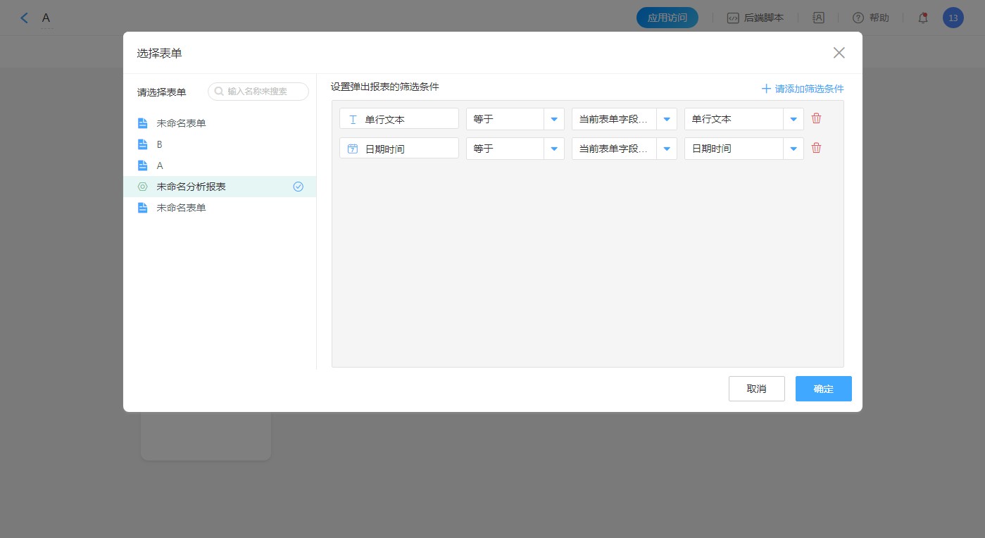 - 点击选择表单弹出弹窗,在弹窗中选择表单或报表。