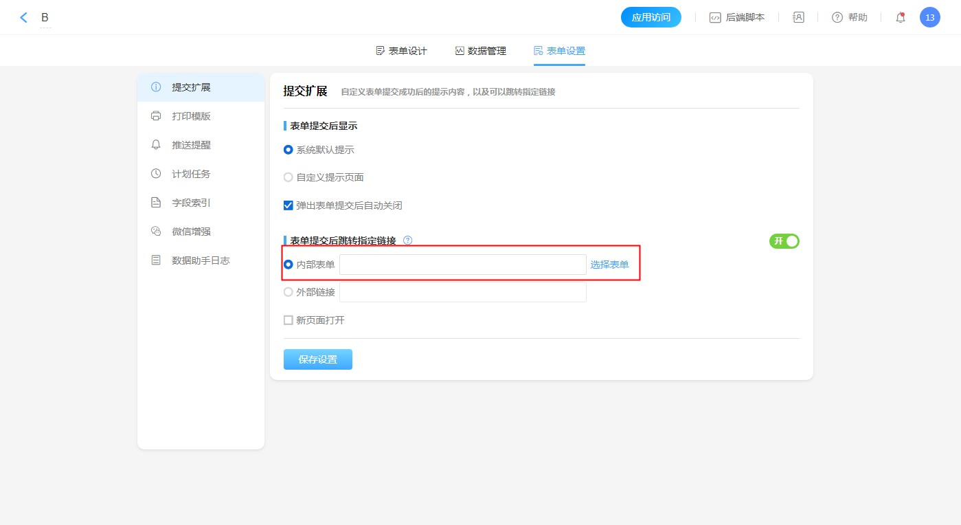 保存设置后,当此表单网页提交数据(非弹窗提交)时,自动跳转到设置的表单,并将字段值写入对应字段中。