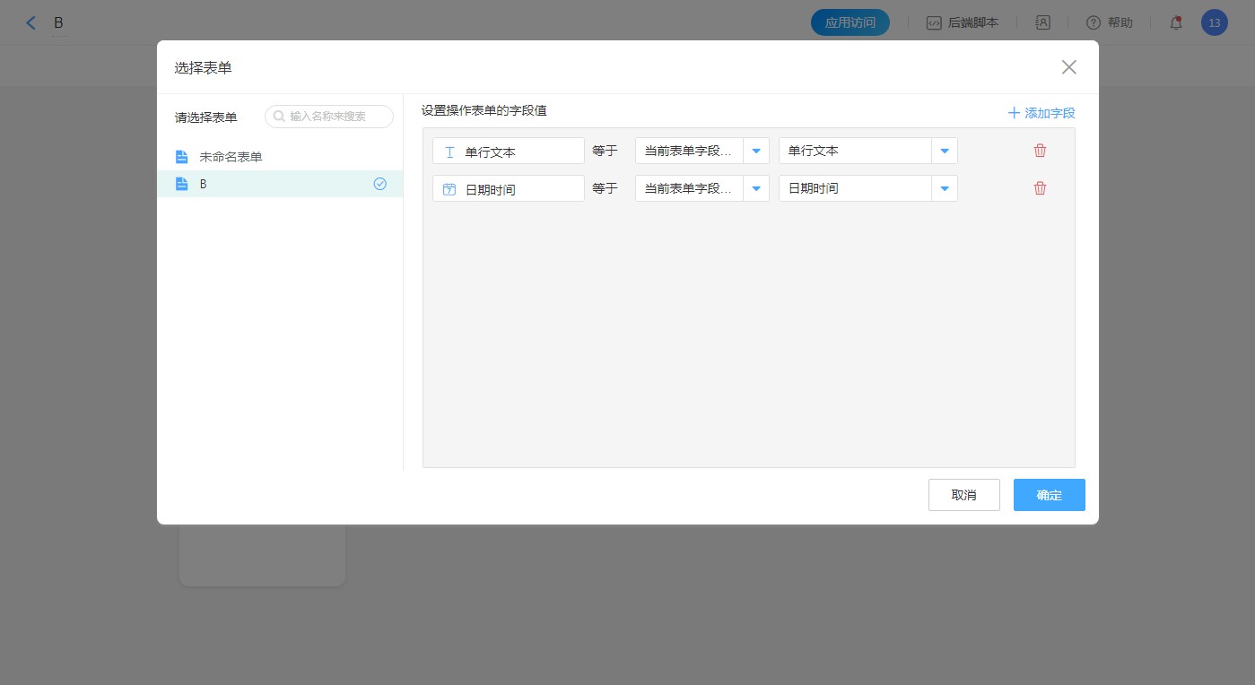 支持将当前表单的数据写入的跳转表单中,在弹窗的右侧可以设置字段对应关系。