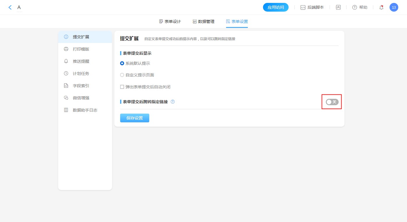 关闭表单提交后跳转指定链接后,提交数据后会进入提交成功提示页面。