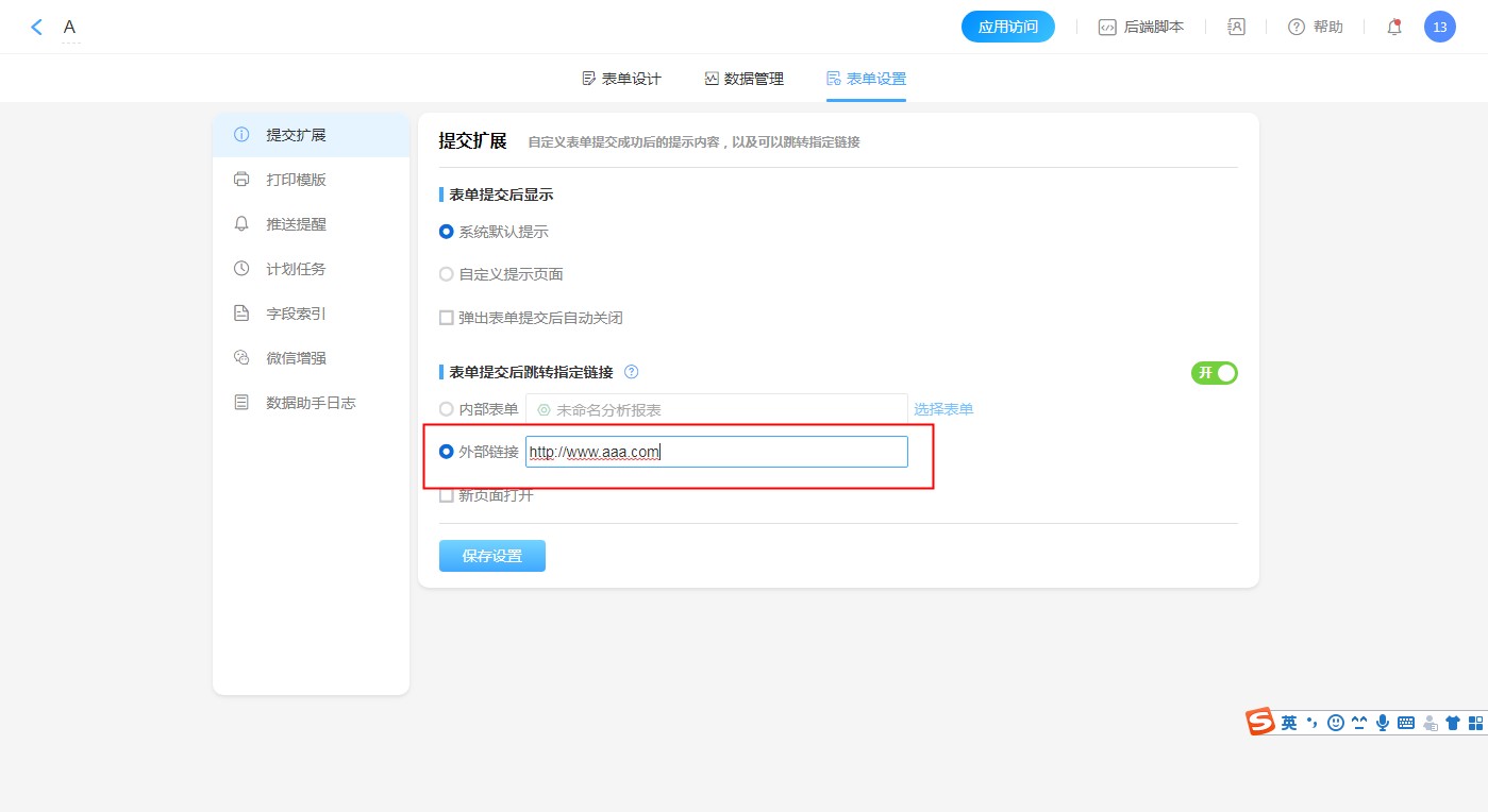 当开启后,可设置表单网页提交后跳转页面链接,可以设置为内部表单/报表、以及外部链接,同时支持将当前消息表单的数据写入跳转的系统内部表单或报表中。