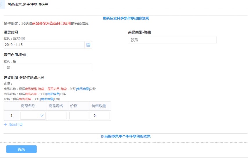 之前我们在使用数据联动时,只能用一个条件进行关联,从而使某个字段的内容跟着上一个字段的变化而自动填写或自动改变选项,现在数据联动可以支持多条件,我们可以使用多个条件进行关联!