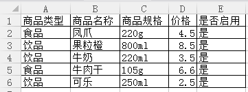 【商品信息】:商品类型、商品名称、商品规格、价格、是否启用,5个字段。