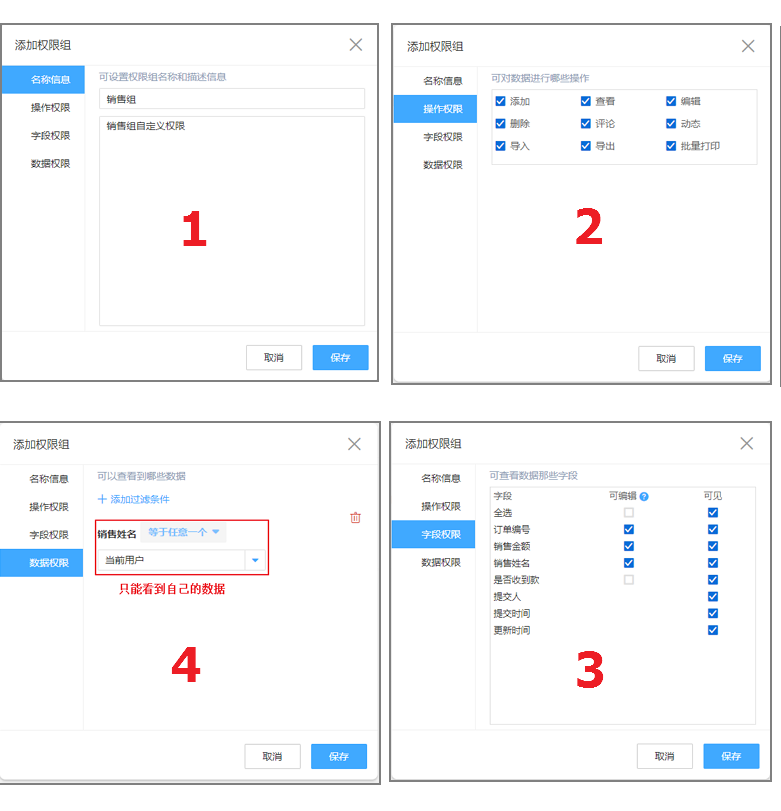- 筛选条件可以自行设置,从该权限组内的可见字段中选取。