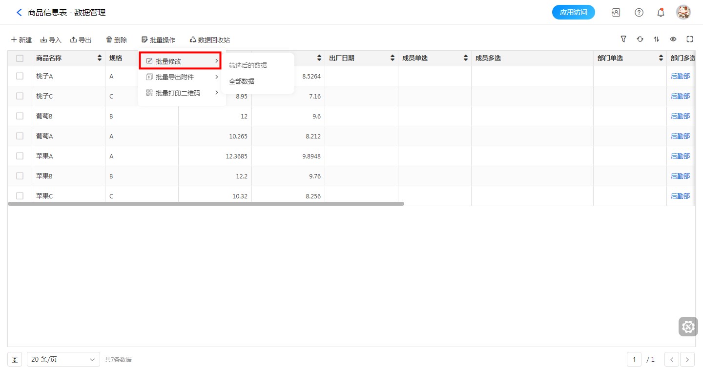 方法一:【数据管理】-【批量操作】-【批量修改】-【修改筛选后的数据】或【修改全部数据】