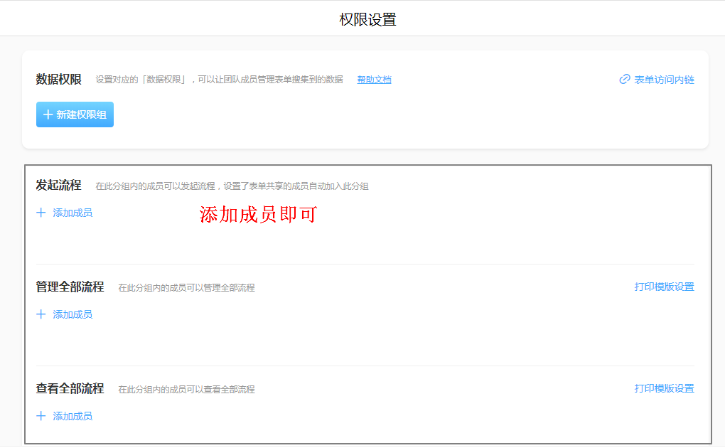 | 发起流程 | 提交数据、发起流程 | 流程发起节点的控件可见可编辑 | 提交数据、发起流程 | 设置了页面共享的成员自动加入此分组 |