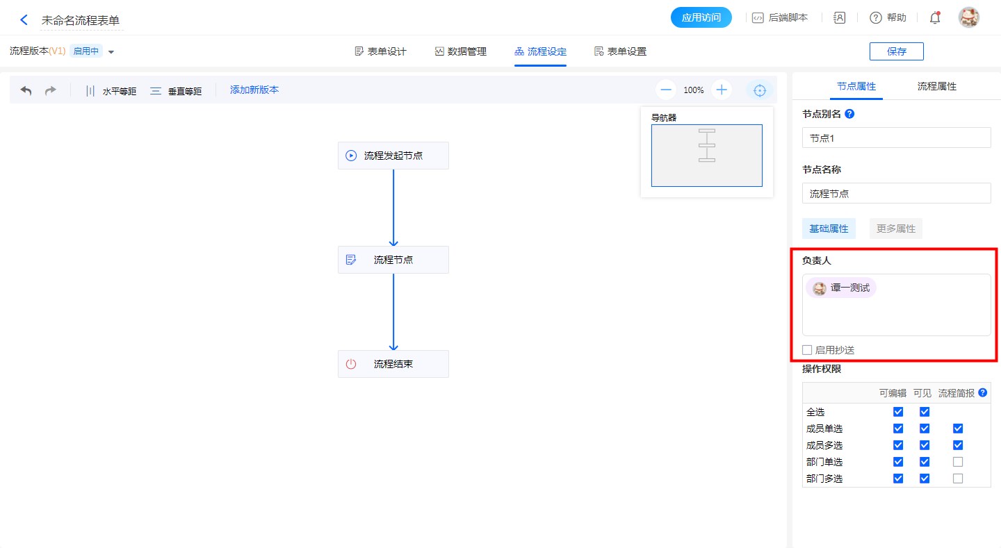 注意:第一个节点(流程发起节点)的负责人默认为发起人,不可更改。