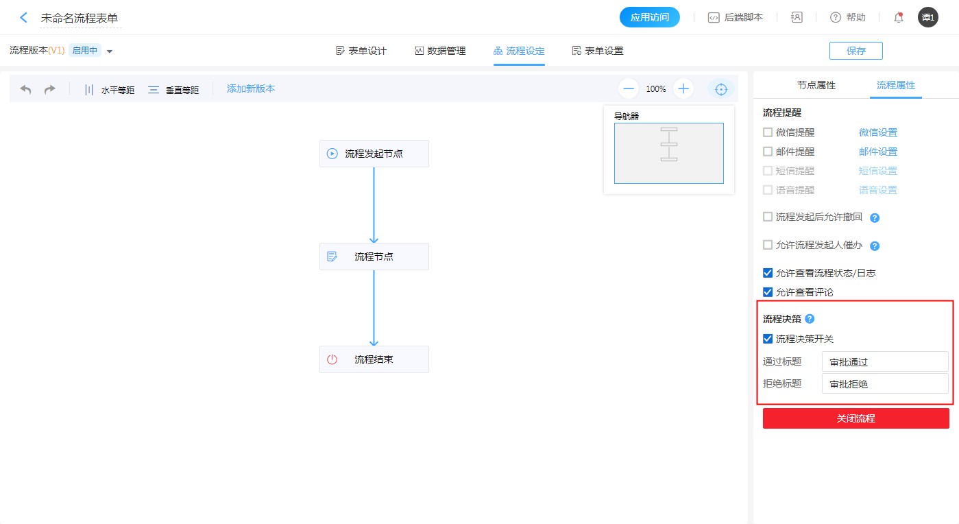 步骤:流程属性—>勾选流程决策开关->可选自定义修改标题。