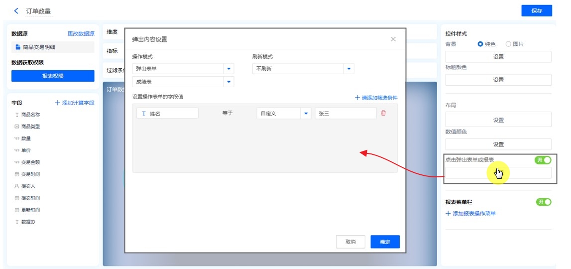 开启并设置后,点击指标数值或者图形区域可以弹出已设置的表单或报表。