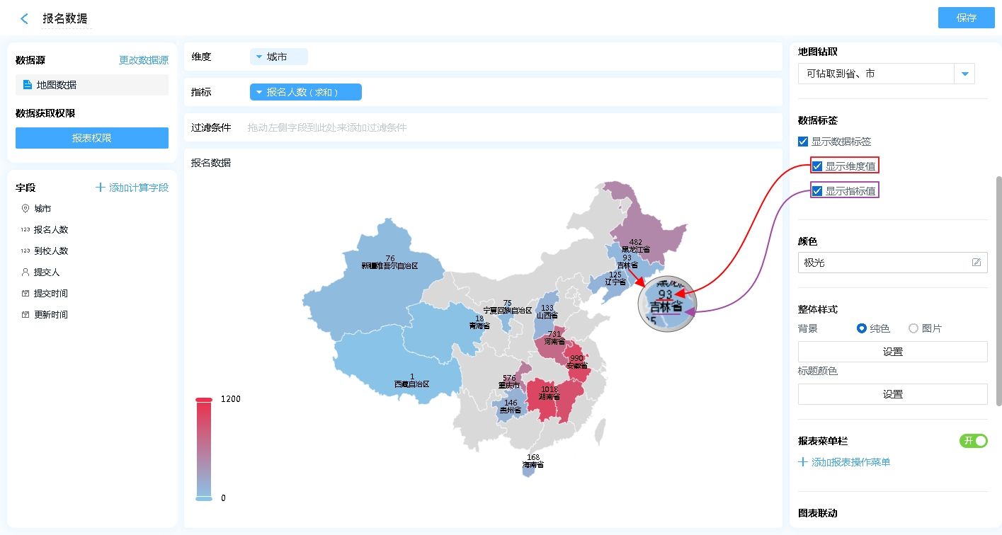 - 显示维度值:在地图上对应的区域显示维度的内容,一般情况下是省/市/县区信息。