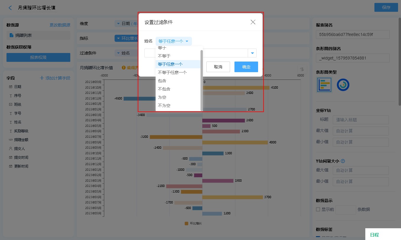 显示名称: 字段添加进入显示字段区域后,可自行修改其在条形图中的表头文字汇总方式: 仅日期时间字段可设置,可以设置按照何种日期格式对数据进行汇总(如:按年、按季度、按月汇总)排序:支持按照指定的格式对条形图内的数据进行排序[默认为数据创建时间]对齐方式:支持报表的排列方式删除字段:此处的删除字段,是指从显示字段中删除,删除后仍可重新添加,不会对原表造成任何影响。