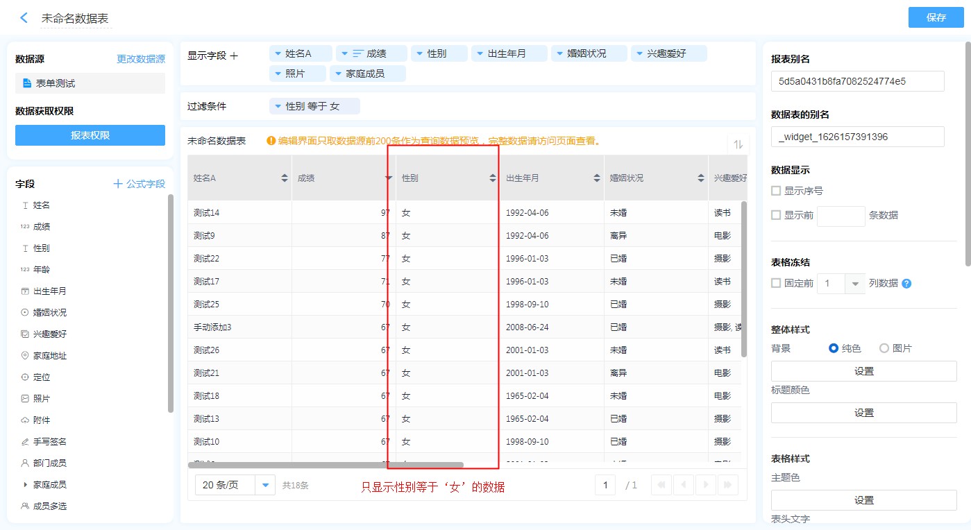若设置了过滤条件,则报表中只出现满足条件的数据。