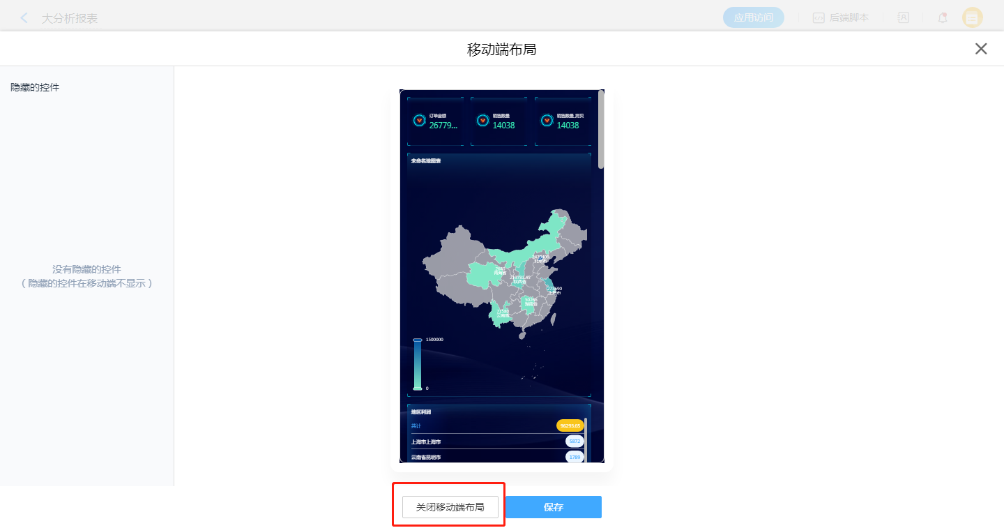 关闭移动布局后,即关闭了在移动布局中的所有设置,移动端访问时,报表按照默认布局展示。